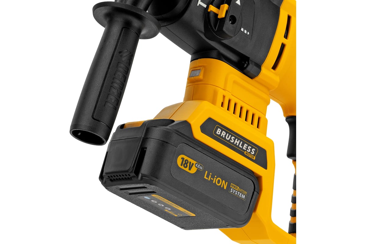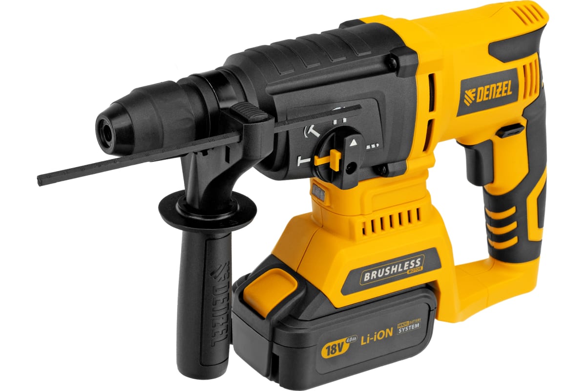 Аккумуляторный перфоратор Denzel BLRH-IB-26 26701 с аккумулятором Li-Ion емкостью 4 Ач и напряжением 18 В предназначен для сверления отверстий в различных материалах, а также для штробления стен, разрушения кирпичной кладки. Поддерживает несколько режимов работы: сверление, бурение, долбление + регулировка положения долота (опция Vario Lock). Максимальный диаметр отверстий в древесине составляет 40 мм, металле — 13 мм, бетоне — 26 мм. Инструмент совершает до 4800 ударов в минуту, развивая энергию до 3 Дж, чем обусловлена его высокая производительность и эффективная работа с твердыми материалами. Перфоратор пригодится для проведения строительных и ремонтных работ.