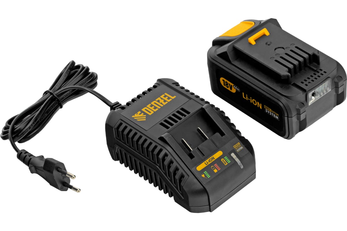 - Универсальный элемент питания — аккумулятор с интеллектуальной системой распознавания нагрузки совместим со всеми инструментами модельного ряда единой платформы Denzel Battery System 18V