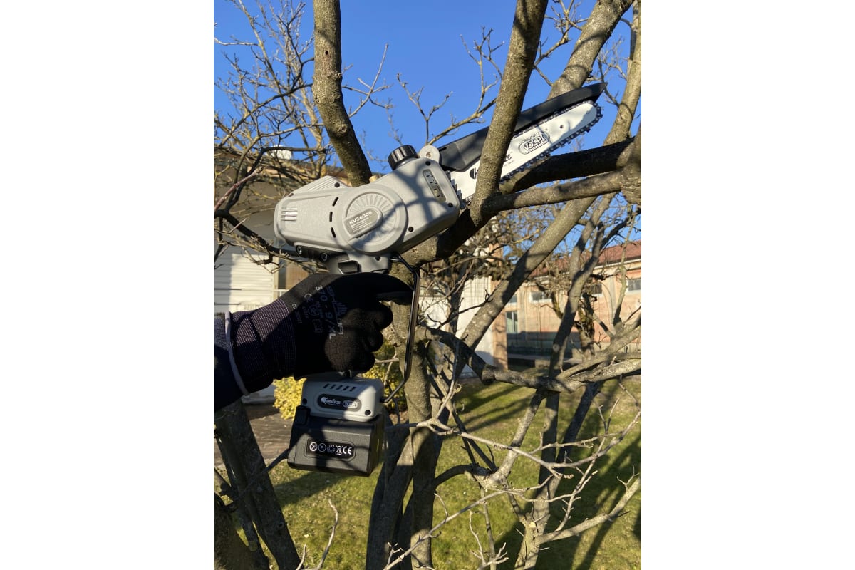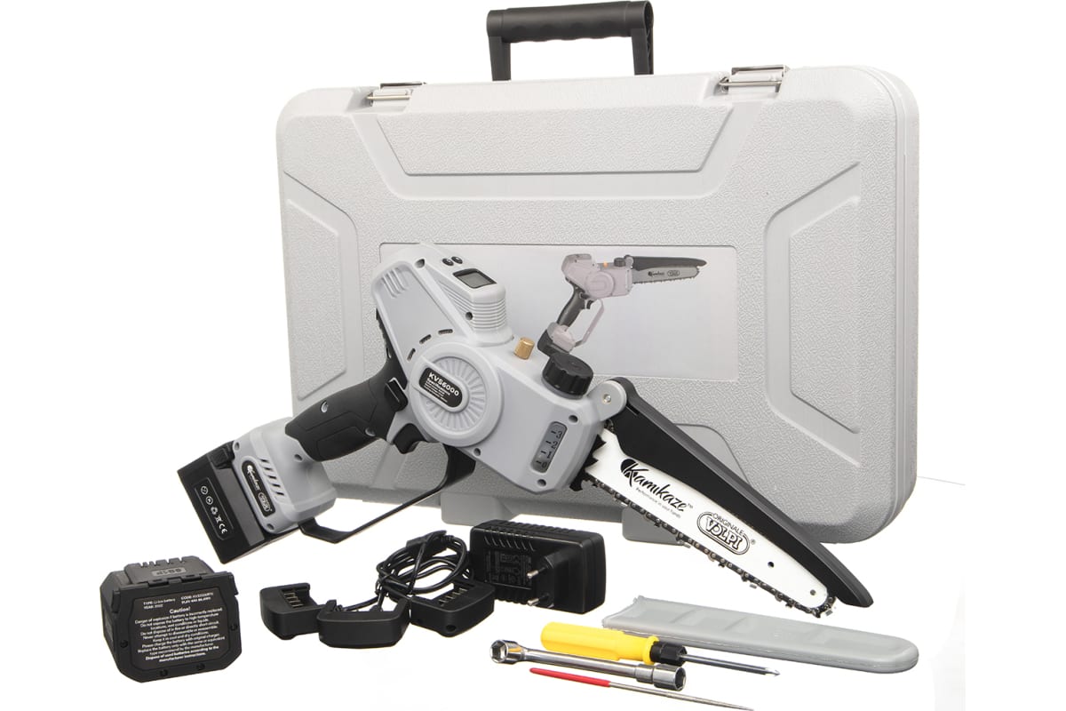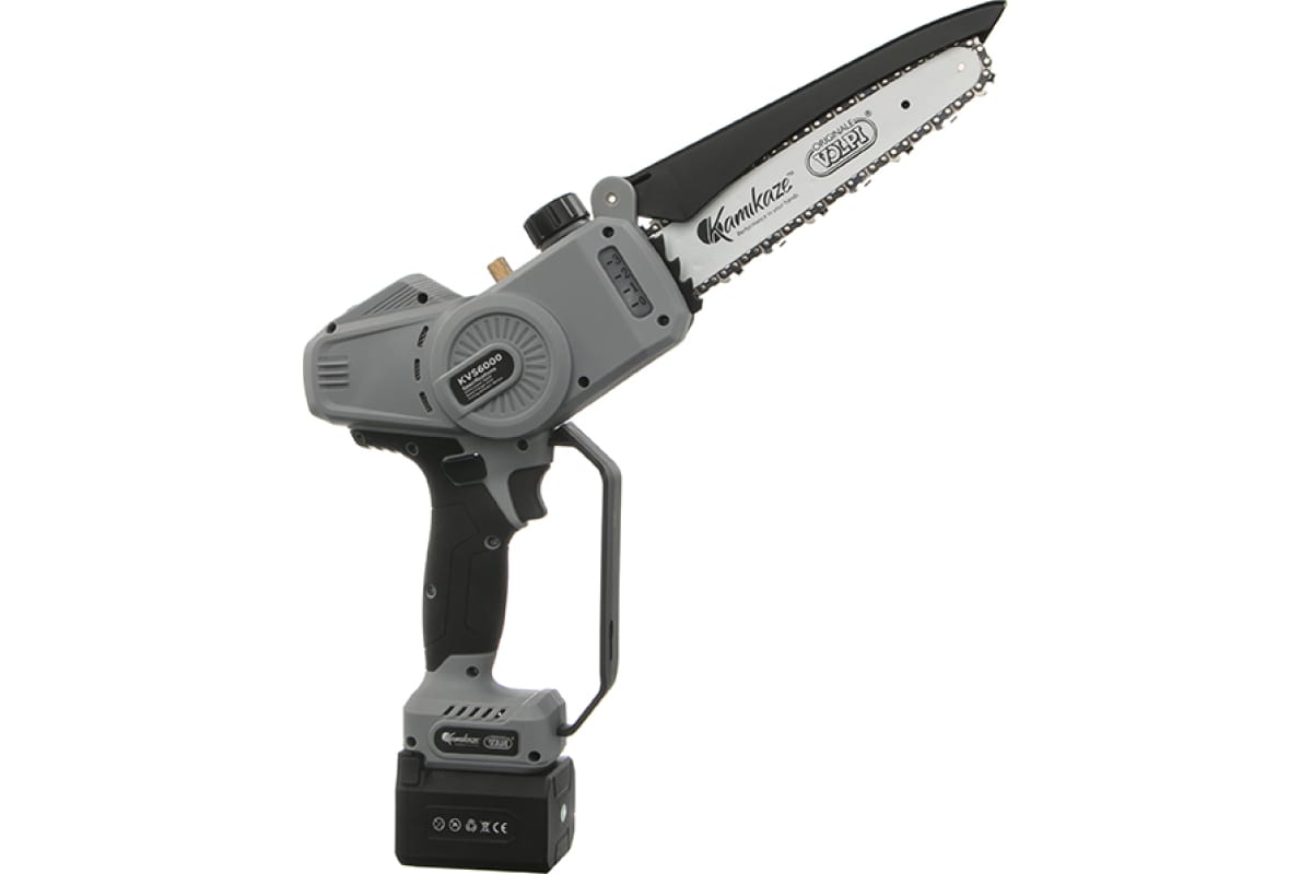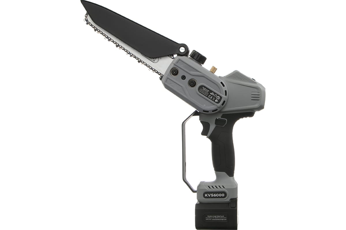 Беспроводная аккумуляторная цепная пила Volpi originale KVS6000 с функцией автоматической подачи масла, дисплеем, шиной 20 см и 2-мя АКБ (LI-ION 21.6 Вольт, 4 Ач) в комплекте. Идеально подходит для столярных работ, обрезки кустов и деревьев. Толщина реза составляет 160 мм.
