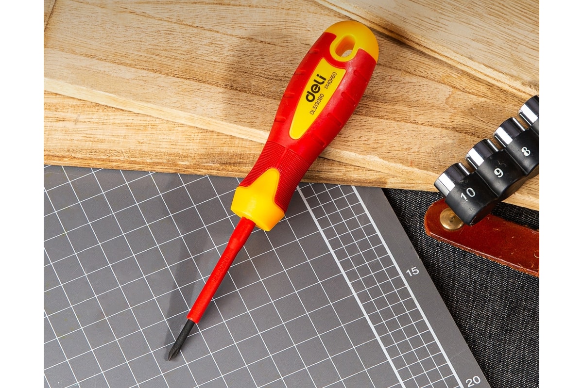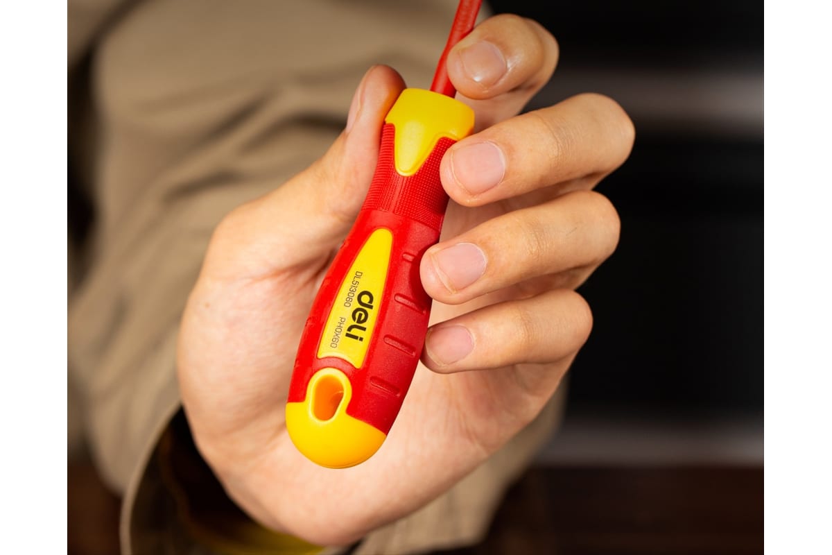 Диэлектрическая крестовая отвертка Deli DL513060 предназначена для работы с объектами, расположенными под электрическим напряжением. В первую очередь она создана, чтобы обеспечить безопасность мастера.