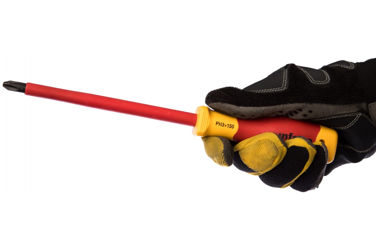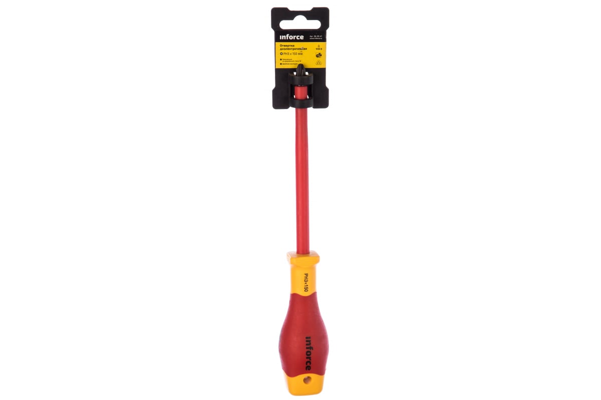Диэлектрическая отвертка Inforce PH3х150мм 06-09-47 позволяет безопасно и с комфортом выполнять крепежные операции в области электромонтажных работ. Инструмент удобно располагается в ладони мастера, не проскальзывает и не выпадает из рук. Для удобства хранения отвертку можно подвешивать за специальное отверстие в хвостовой части рукоятки.