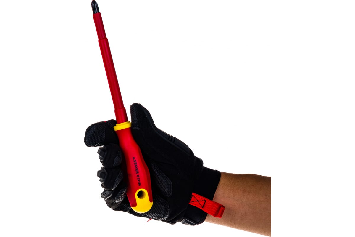 Диэлектрическая отвертка PH № 3 х 150 мм STAYER 25142-3-15_z01 благодаря изоляционному материалу может использоваться при работе под напряжением до 1000 Вт. Удобству способствует противоскользящая рукоятка. Стержень выполнен из Cr-V стали, что дает гарантию долгого срока службы инструмента. Крестообразная рабочая часть намагничена для облегчения работ с мелкими болтами.