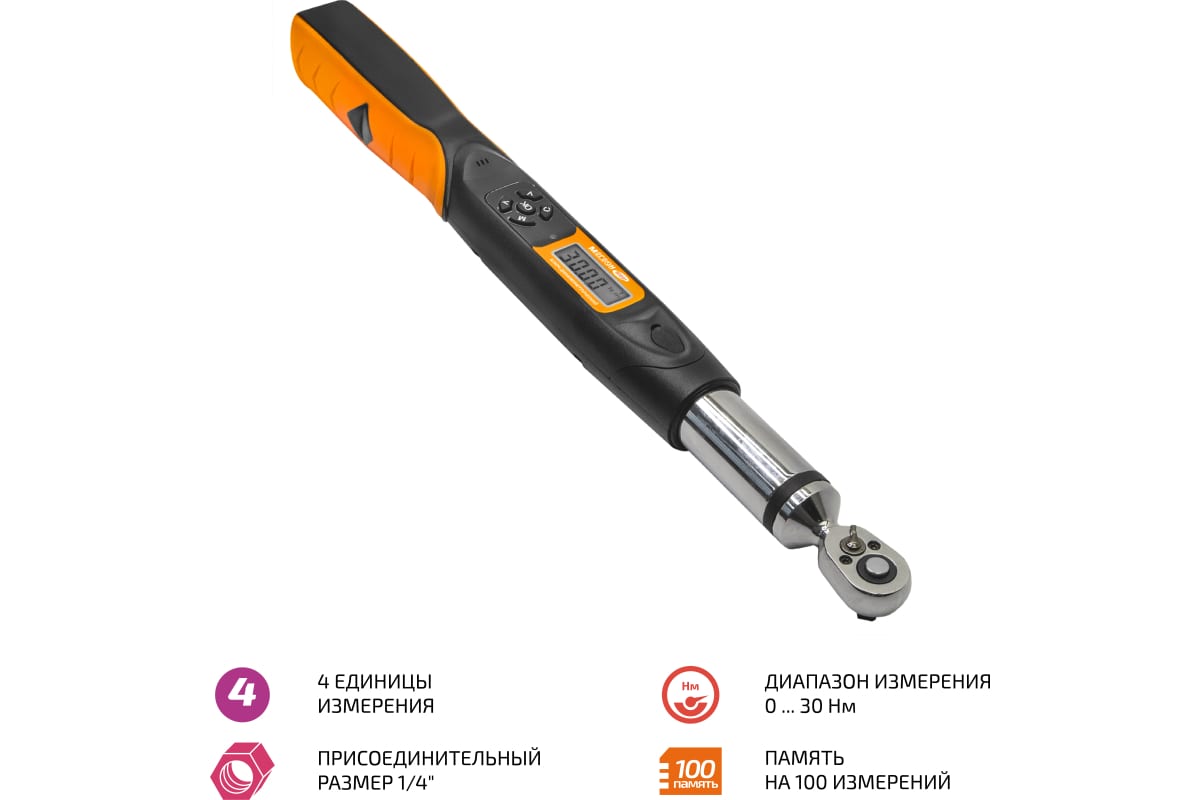 Цифровой динамометрический ключ, предназначенный для контроля затяжки элементов крепежа в диапазоне 1.5-30 Нм и разрешением 0,01. Имеет простой интерфейс программного обеспечения, хромированное покрытие металлических частей и прочный механизм трещотки с возможностью работы в обе стороны.