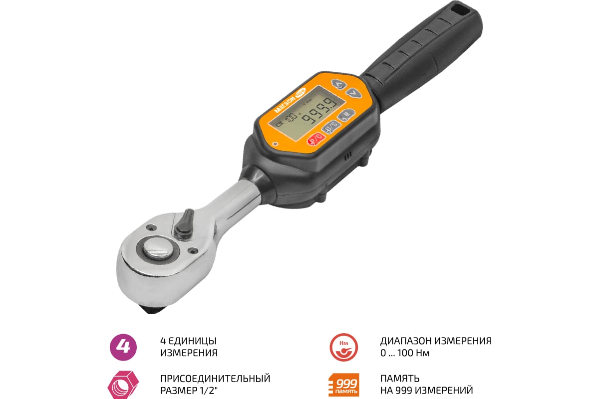 МЕГЕОН 60016 - это цифровой динамометрический ключ, предназначенный для контроля затяжки элементов крепежа в диапазоне 0 ... 100 Нм и разрешением 0,1. Имеет простой интерфейс программного обеспечения, хромированное покрытие металлических частей и прочный механизм трещотки с возможностью работы в обе стороны. Прибор оборудован звуковой и световой сигнализациями, а также функцией автоматического выключения, которая даёт возможность значительно увеличить срок службы батарей питания. Автоматическое включение подсветки дисплея при появлении нагрузки является преимуществом перед аналогами, а наличие памяти на 999 измерений не оставит никого равнодушным. Инструмент высоко оценят профессионалы и любители. Он станет прекрасной альтернативой аналогичным вороткам и сможет удовлетворить требования самых искушённых специалистов.