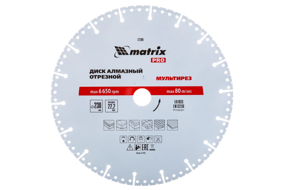 Алмазный отрезной диск Matrix PRO Мультирез 73200, 230 х 22,2 мм, применяется для сухого и мокрого резания бетона любой твердости, железобетона, гранита, кирпича, металла, древесины, пластика и других материалов. Используется в качестве универсального режущего инструмента в профессиональной сфере, например, строительными, специальными службами, сотрудниками МЧС. К работе с диском необходимо приступать после ознакомления с руководством пользователя.