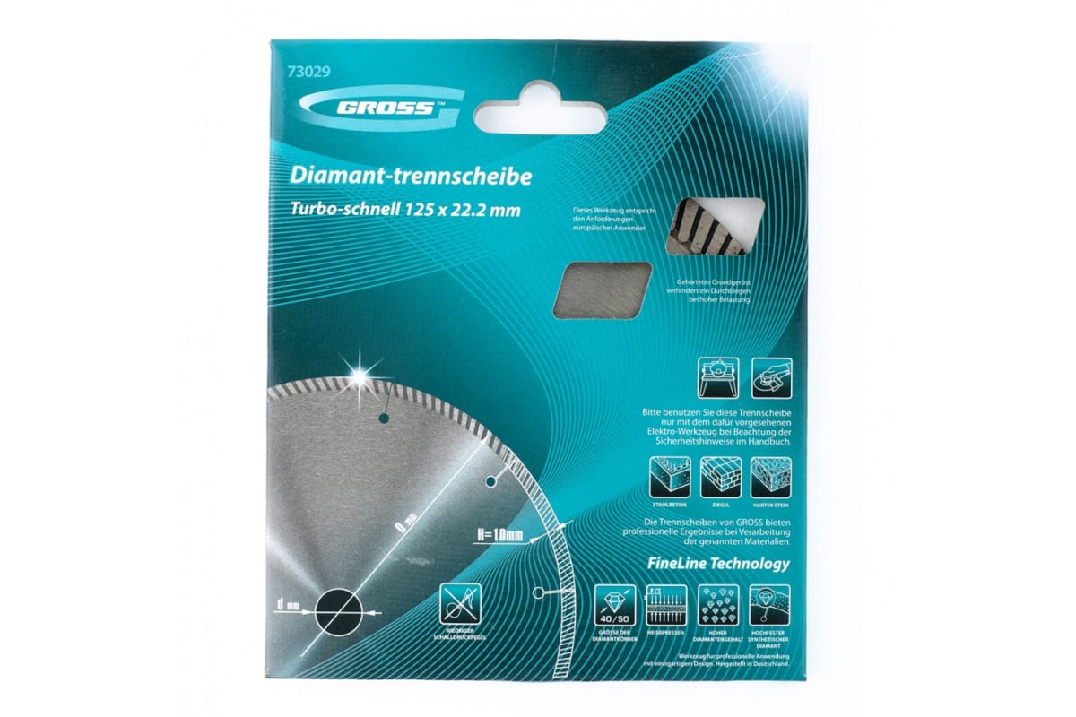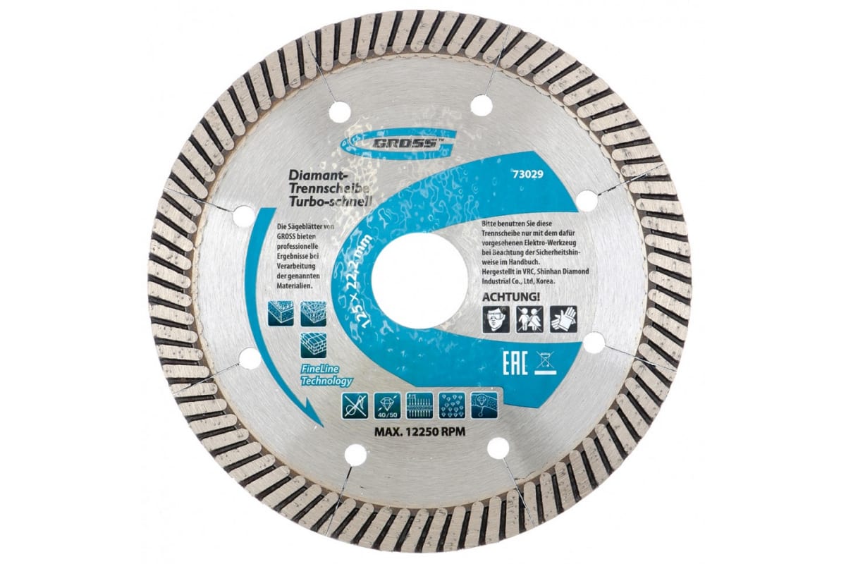 Диск алмазный турбо с лазерной перфорацией GROSS 73029 используется в угловых шлифовальных машинах для сухой резки бетона, железобетона, мрамора, шлакоблоков и гранита. Оснащен компенсационными прорезями, для уменьшения колебаний, шумов, а также для исключения перегрева и деформации диска.