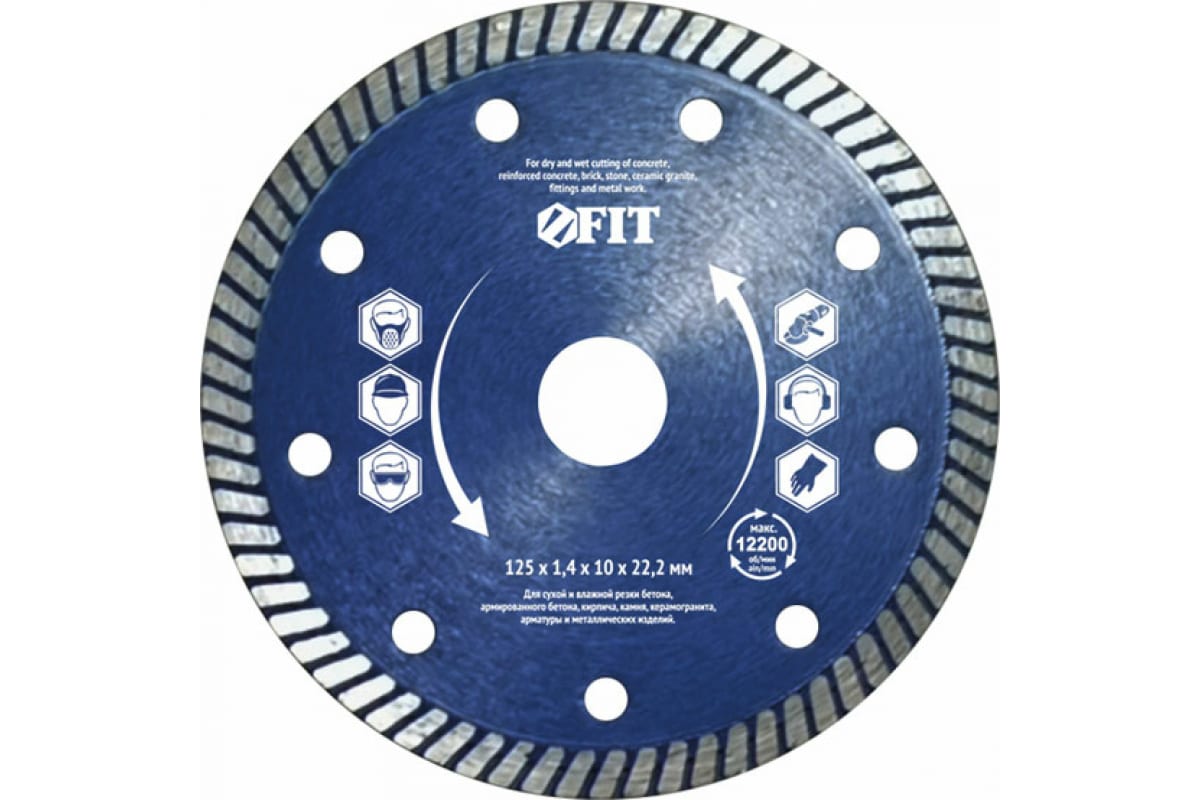 Диск отрезной алмазный универсальный Армобетон турбо 125x1.4x10x22.2 мм FIT 37347 для сухой и влажной резки бетона, кирпича, гранита, керамогранита, мрамора и камня. За счет специально подобранных компонентов металлической связки, применения технологии горячего спекания и повышенной концентрации алмазов диск подходит для резки армированного бетона, арматуры и других металлических изделий.