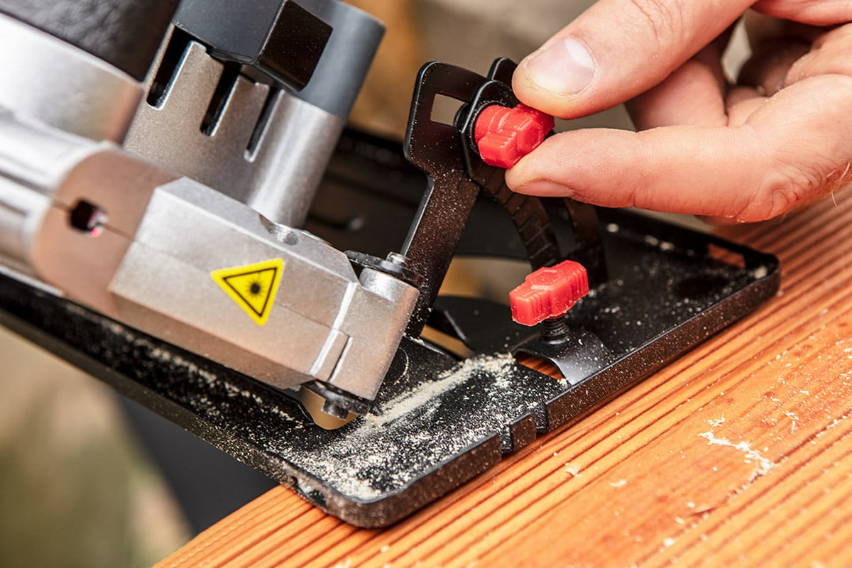 - Бесступенчатая регулировка глубины и угла пиления для точных работ