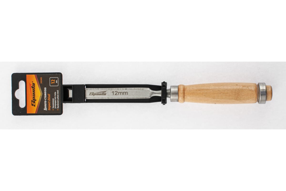 Долото-стамеска SPARTA 12 мм, деревянная рукоятка 242445 предназначено для столярных и плотничных работ- выборка и зачистка небольших прямоугольных пазов, снятия фасок в натуральной древесине любой твердости. Полотно стамески выполнено из конструкционной стали 45 и остро заточена. Твердость инструмента на длине 0,7 рабочей части полотна составляет 45-55 HRC. Рукоятка имеет защитное лакокрасочное покрытие и оборудована металлическим кольцом с тыльной стороны, которое предотвращает раскол дерева при ударах молотком или киянкой.