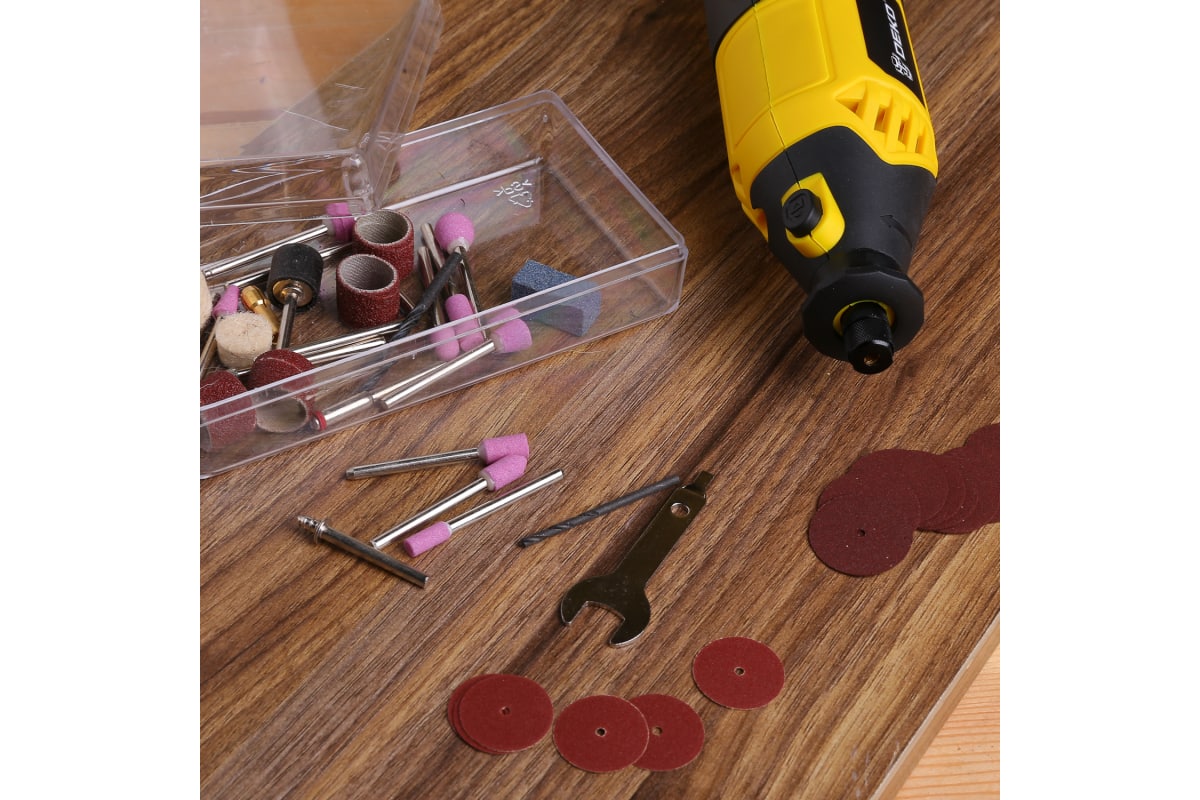 Электрический цифровой гравер 350Вт, набор 43 инструментов DEKO DKRT350E-LCD 43 tools, case 063-1413 идеально подходит для шлифования и полировки небольших поверхностей благодаря автоматически регулируемой мощности и различным аксессуарам.