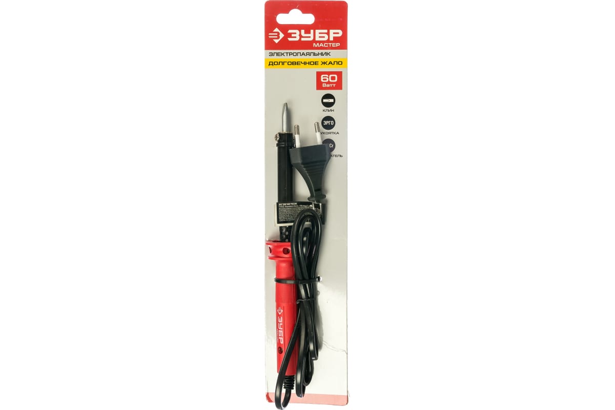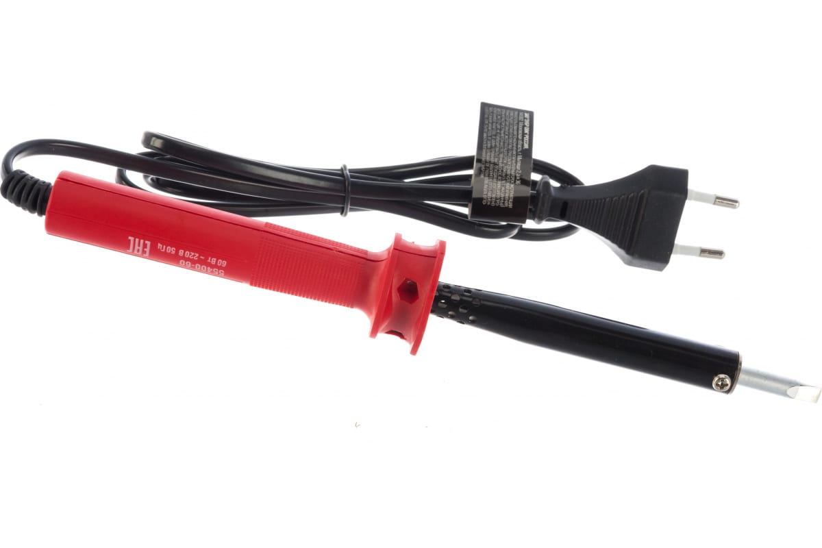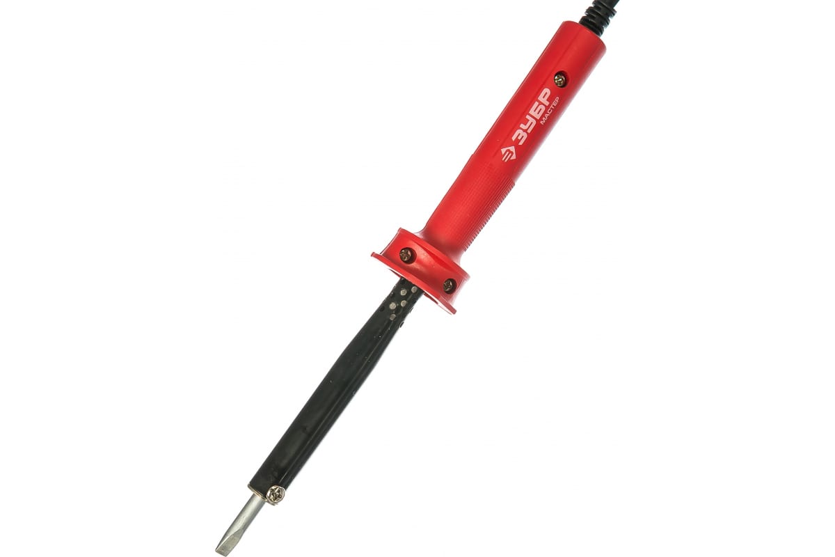 Электропаяльник ЗУБР МАСТЕР с пластиковой рукояткой и долговечным жалом, форма клин, 60Вт 55400-60 подойдет для пайки радиодеталей и проводов.