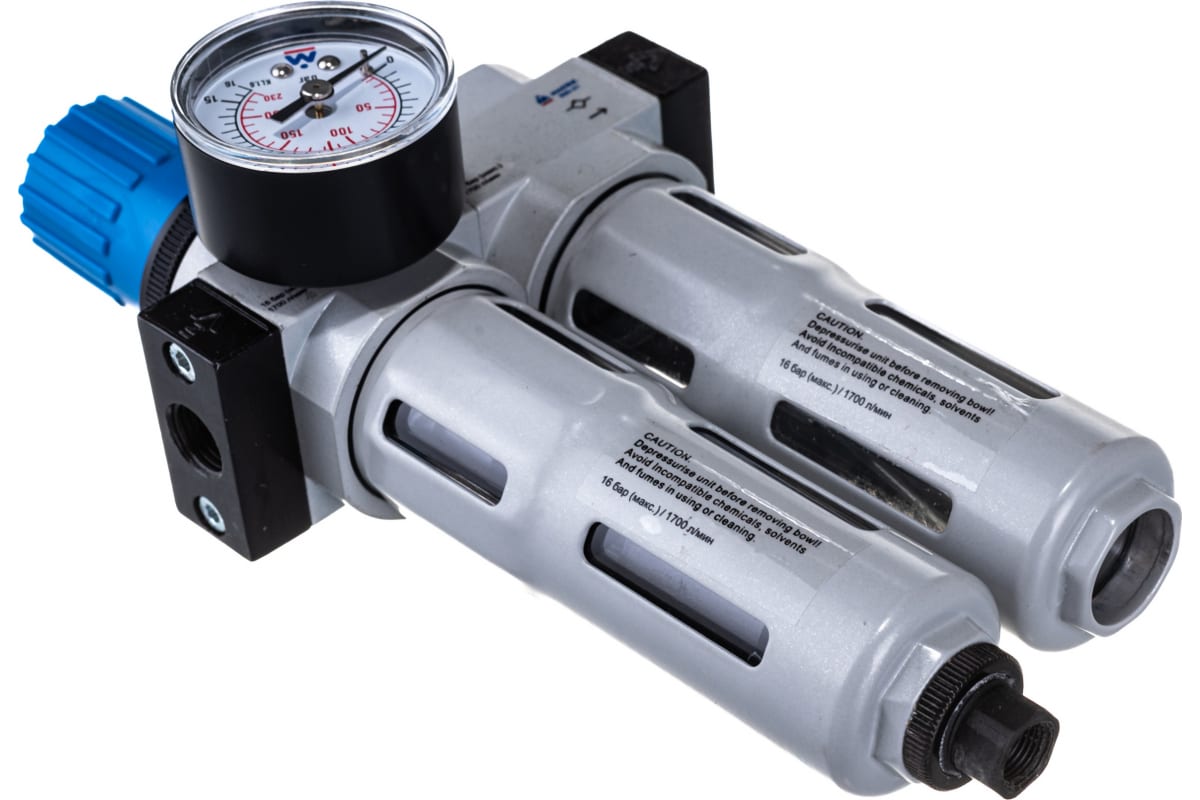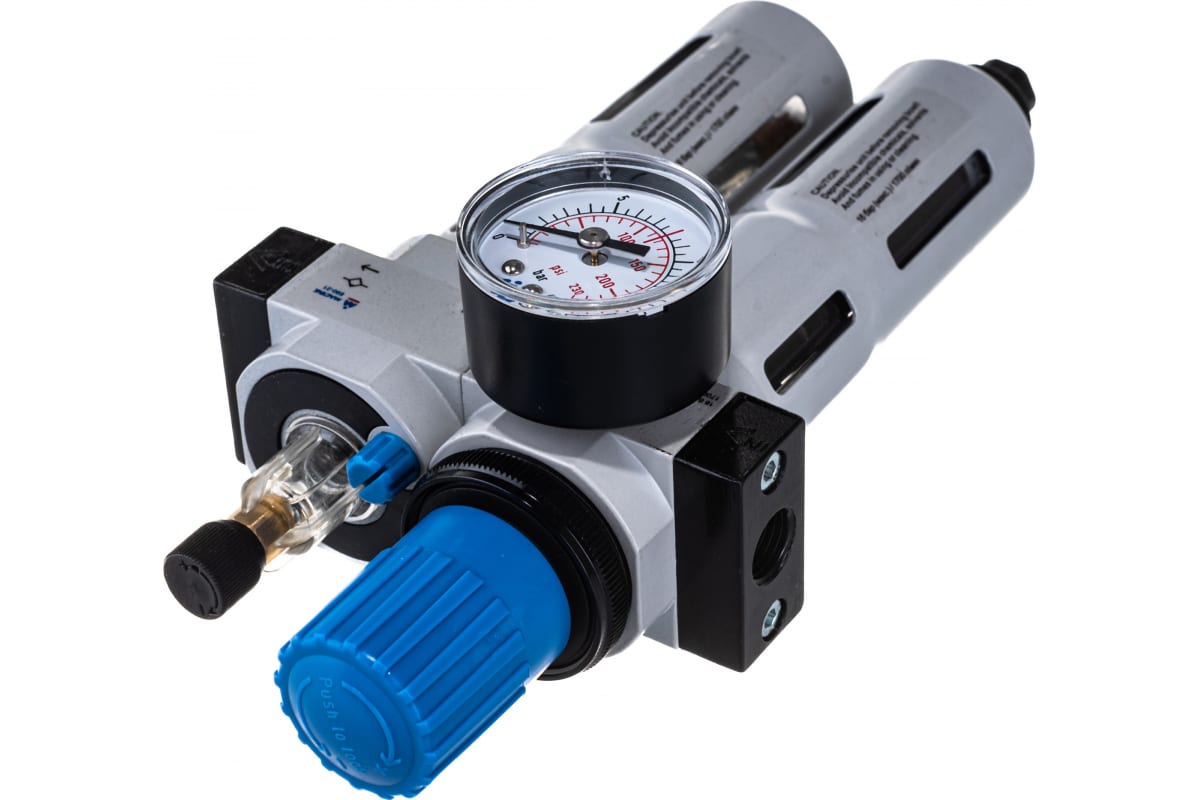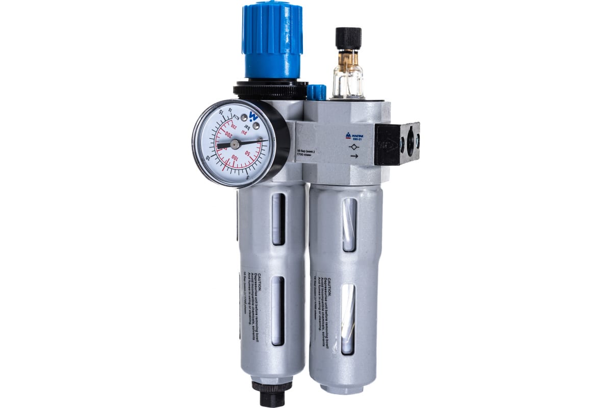 Фильтр влагоотделитель с редуктором и лубрикатором МАСТАК 690-21 используется совместно с компрессорным оборудованием и пневмоинтрументом. Фильтр-масло/влагоотделитель применяется для очистки сжатого воздуха от механических частиц, воды и минерального масла. Лубрикатор предназначен для подачи смазывающих материалов и поддержания постоянной концентрации воздух-масло. Имеет возможность регулировки подачи масла. Регулятор давления применяется для контроля и фиксации давления в пневмосистеме. Уровень давления регулируется с помощью вентиля и отображается на встроенном манометре. Скоба-держатель используется при сборке и закреплении блока подготовки воздуха на вертикальной поверхности.