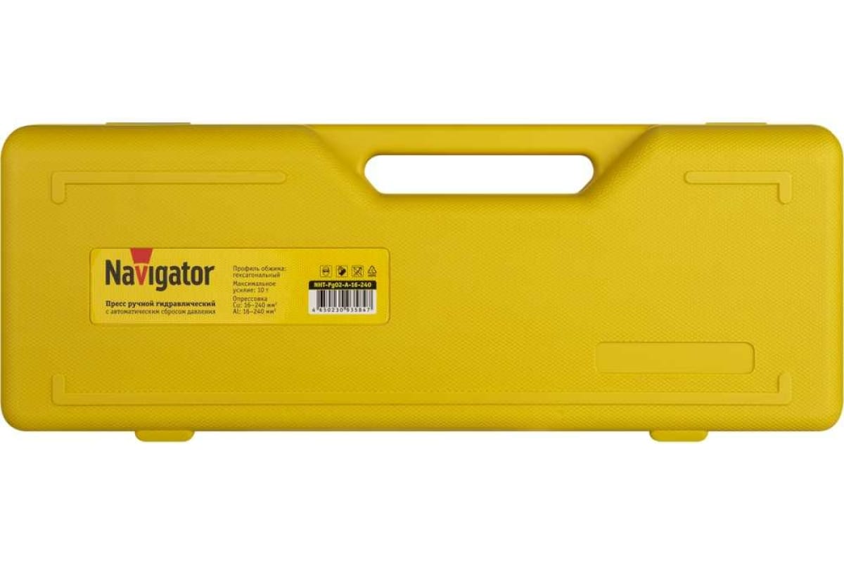 Гидравлический пресс Navigator 93 584 nht-pg02-a-16-240 асд, 16-240 мм2 93584 используется для опрессовывания неизолированных медных, алюминиевых, алюмомедных силовых наконечников и гильз на провода и кабели с медными и алюминиевыми жилами. Эксплуатационный ресурс плунжерного насоса увеличен в 3 раза за счет клапана автоматического сброса давления, который помогает избежать перегрузок.