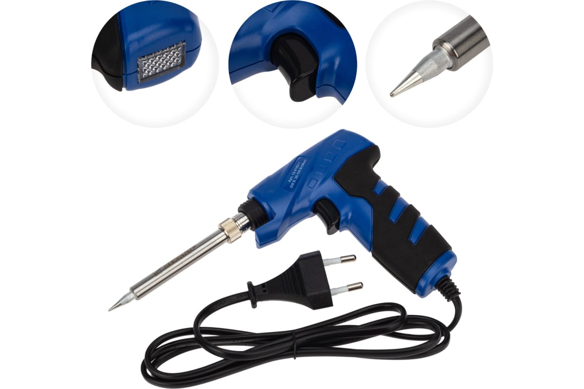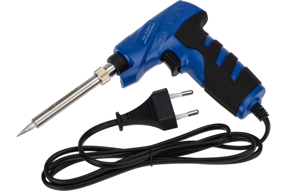 Импульсный паяльник с керамическим нагревателем Профи 220В, 25-130Вт REXANT ZD-723N 12-0162-1 используется в домашних условиях для распайки кабелей и монтажных/демонтажных работ радиоэлементов. Устройство может использоваться в двух режимах 25 и 130 Вт. Повышение мощности и ускоренный нагрев достигаются путем нажатия и удержания курка. Пистолетная форма ручки удобна в обхвате и не проскальзывает благодаря прорезиненным вставкам. Паяльник отличается надежностью, долговечностью и низким уровнем электропотребления.