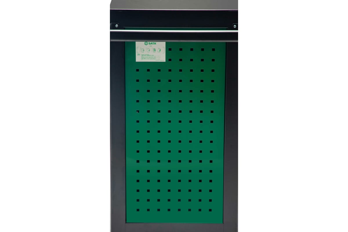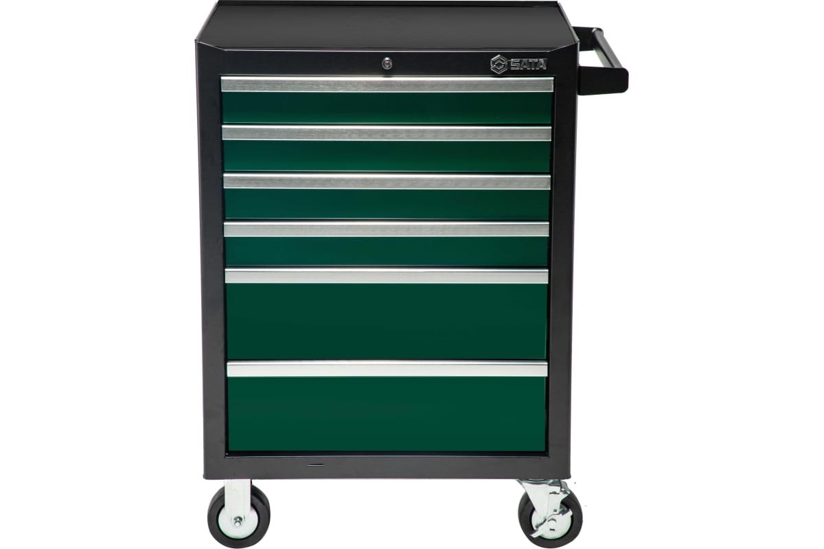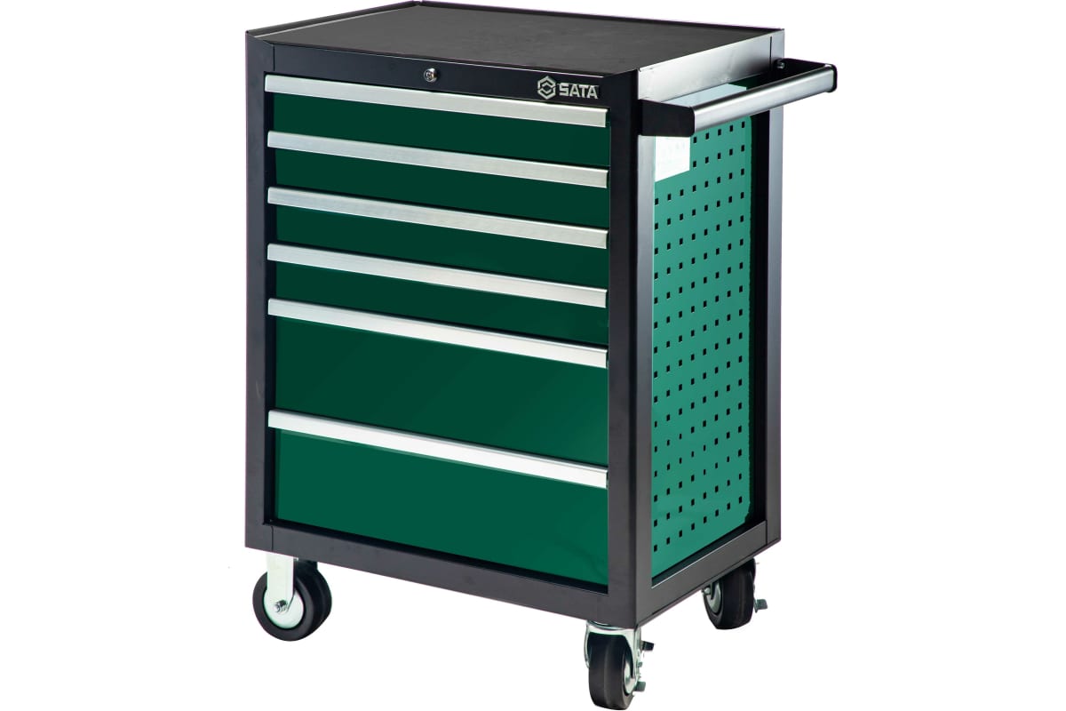 Инструментальная тележка Sata 692x488x840 мм, 6 выдвижных лотков, отдельно доп. перфорированная панель для инструментов 95126 предназначена для рациональной организации рабочего места. В изделии используется высококачественный холоднокатаный стальной лист, обладающий высокой прочностью и долговечностью. Усиленные шариковые направляющие толщиной 45 мм могут легко и плавно открываться и закрываться даже при номинальной максимальной нагрузке. 5-дюймовые усиленные ролики обеспечивает плавное бесшумное открытие. Прочная глянцевая ручка из алюминиевого сплава отличается удобством использования. Специальное напыление поверхности исключает возникновение коррозии. Поролоновая обивка во всех ящиках создает удобство хранения. Общая статическая грузоподъемность.