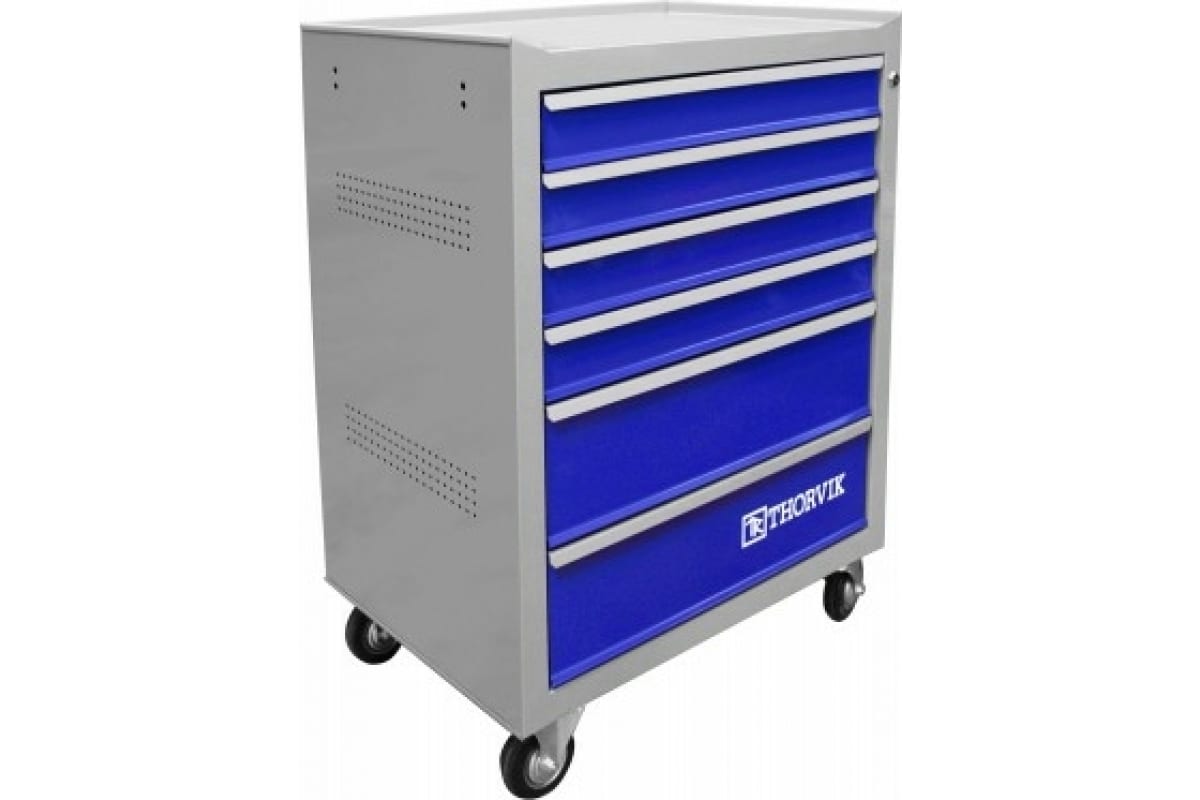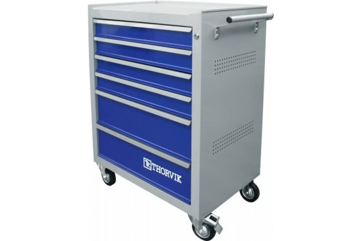 Инструментальная тележка Thorvik ТТ6GB-R 6-ти полочная, серая с синими ящиками 53401 предназначена для хранения и транспортировки ручного инструмента, крепежа, запчастей и деталей. Тележка оснащена антивандальным замком, который полностью исключает возможность вскрытия при помощи подручных средств. ручку перемещения можно установить справа или слева инструментальной тележки.