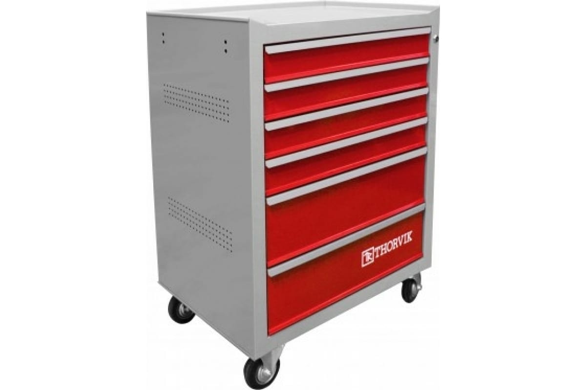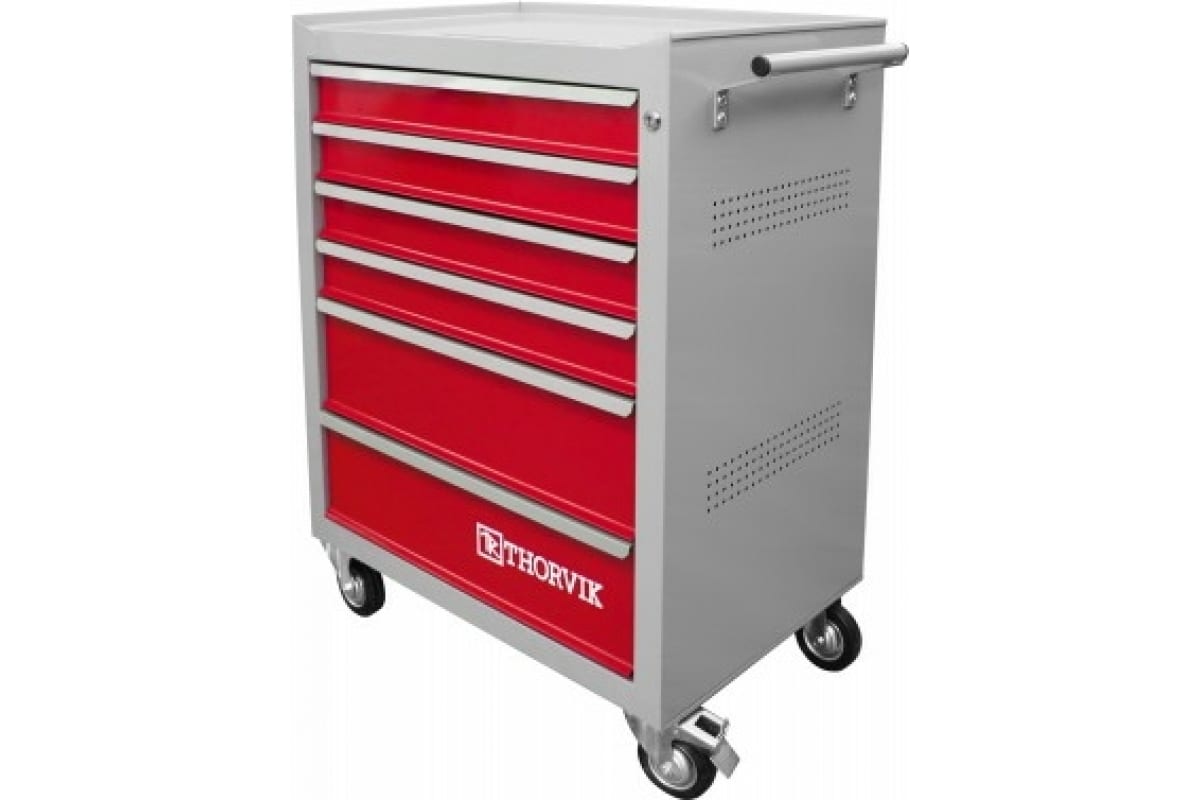 Инструментальная тележка THORVIK ТТ6GR-R 6-ти полочная, серая с красными ящиками 53402 предназначена для хранения и транспортировки ручного инструмента, крепежа, запчастей и деталей. Тележка оснащена антивандальным замком, который полностью исключает возможность вскрытия при помощи подручных средств. ручку перемещения можно установить справа или слева инструментальной тележки.