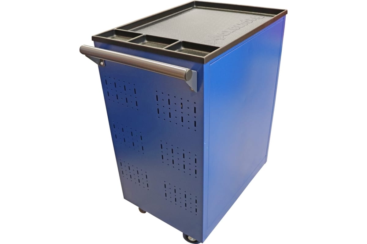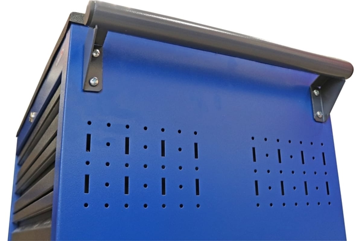 Перфорация, нанесенная на боковые стенки, позволяет устанавливать навесной инструмент или крючки. Выдвижные ящики оснащены центральным замком и шариковыми телескопическими направляющими полного выдвижения. Модель изготовлена из высококачественного металла и покрашена немецкой порошковой краской. Фурнитура изготовлена в Италии и Турции.