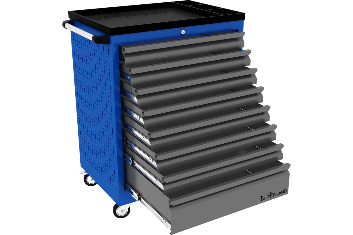 Инструментальная тележка Верстакофф PROFFI 950.8 103117 представляет собой конструкцию, состоящую из восьми ящиков, на крепких колесах. Конструкция оснащена рукояткой для перемещения изделия по рабочей территории. Прочный металлический корпус в виде тумбы закрытого типа окрашен порошковой эмалью и не подвержен коррозии. Ящики имеют центральный замок, что обеспечивает надежную защиту хранимых предметов от постороннего доступа.