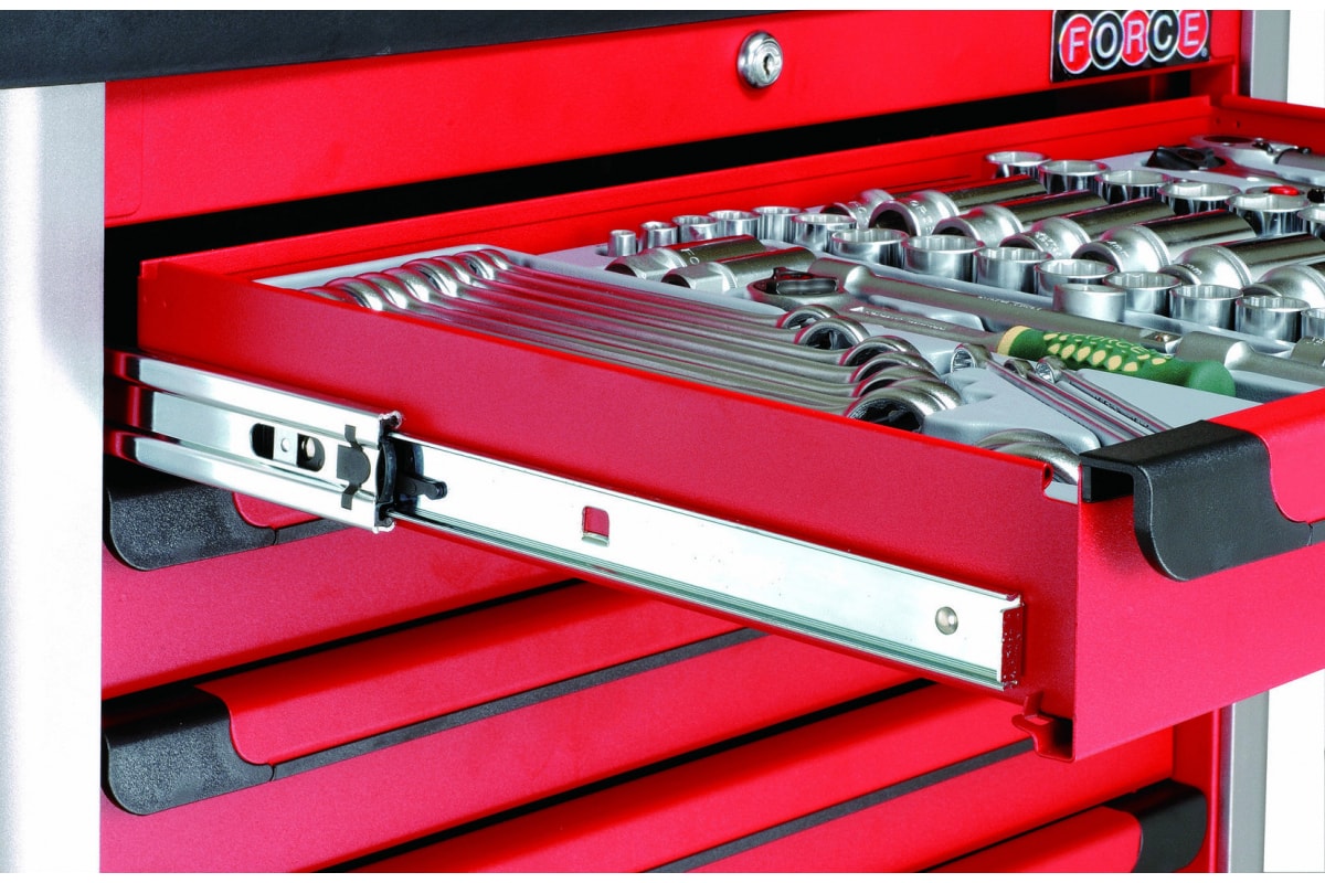 Инструментальная тумба 7 секций, 286пр, красная FORCE 10217R-286 служит для организации рабочего места для механика или автослесаря на СТО или в ремонтном цехе. 7 выдвижных отделений (2 ящика + 5 полок) позволяют с удобством разместить и хранить инструмент, оснастку, запчасти и пр. Поворотные колеса существенно облегчают перемещение данного изделия по рабочей площадке.Тумба оснащена системой защиты от опрокидывания (блокировка открытия двух и более полок одновременно).