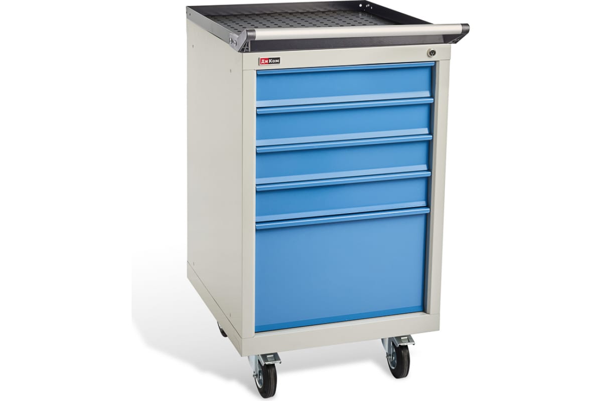Инструментальная тумба Диком ВЛ-К-015-01 набор 11.0421-101 имеет сварной корпус, оснащена пятью выдвижными ящиками. Ящики закрываются общей системой запирания Euro-Locks. Рекомендуемая максимальная нагрузка на ящик — 30 кг.