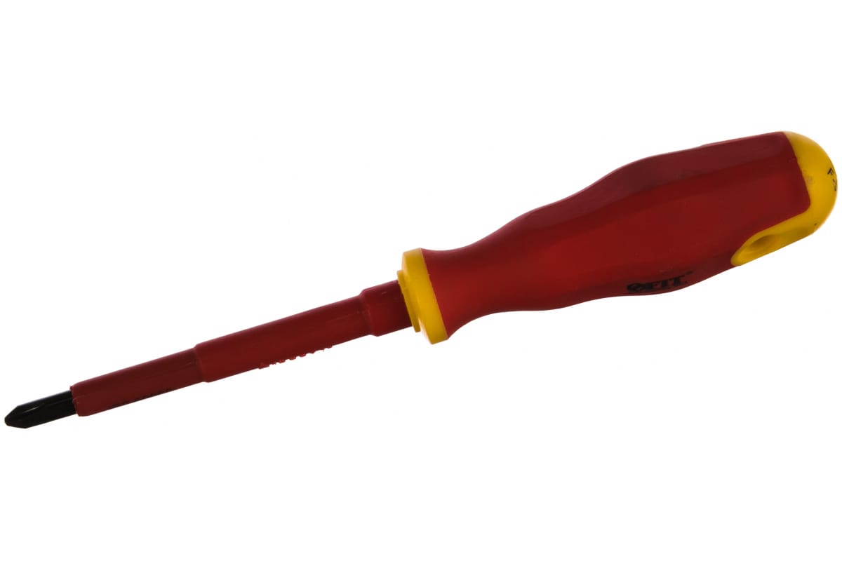 Изолированная отвертка 6,5х100 мм РН2 FIT 55894 - ручной инструмент для монтажа. Прорезиненная мягкая ручка является диэлектрической. Намагниченный наконечник упрощает работу с инструментом. Стержень изготовлен из хром-ванадиевого сплава и изолирован. Размер шлица - РН №2.