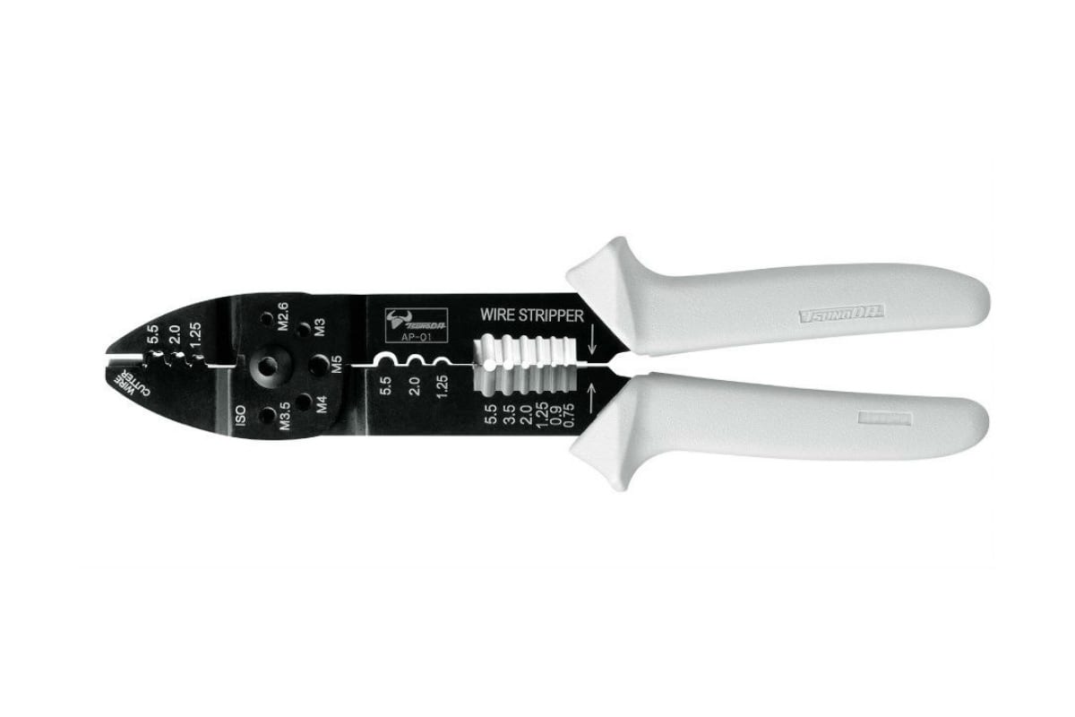 Кабельные клещи TSUNODA AP-02 - универсальная модель, которая выполняет сразу несколько трудоемких операций: съемник изоляции, кусачки, обрезка винтов, обжим клемм. Рукоятки выполнены из мягкой нескользящей резины.
