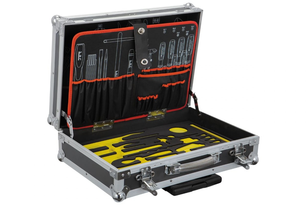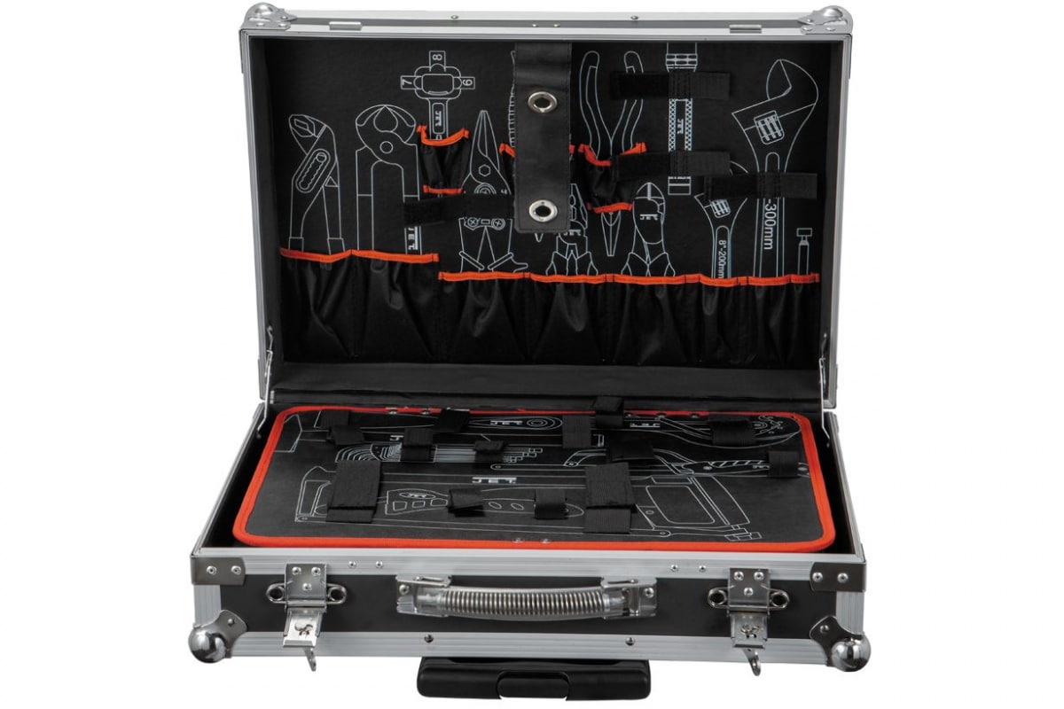 Кейс-чемодан для инструментов JET E-69S-EXE E-69300 предназначен для хранения ручного инструмента. Есть надежные замки, выдвижная ручка и колеса для удобства транспортировки.