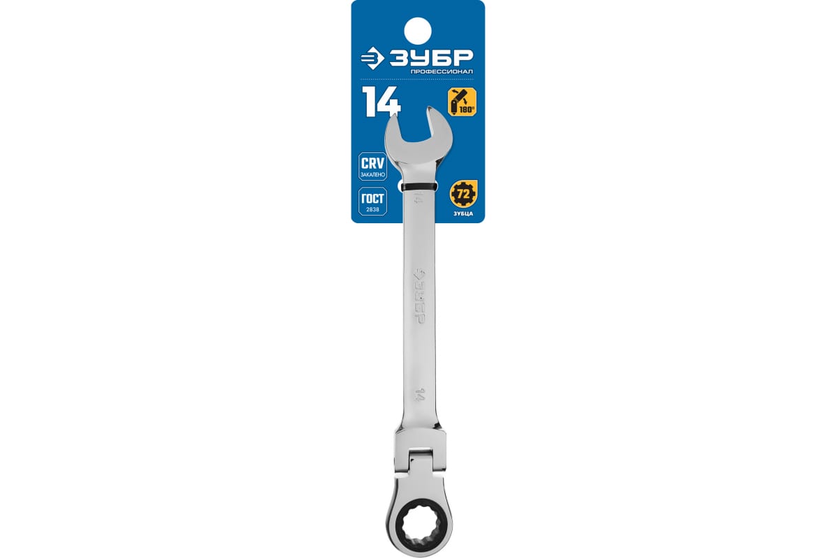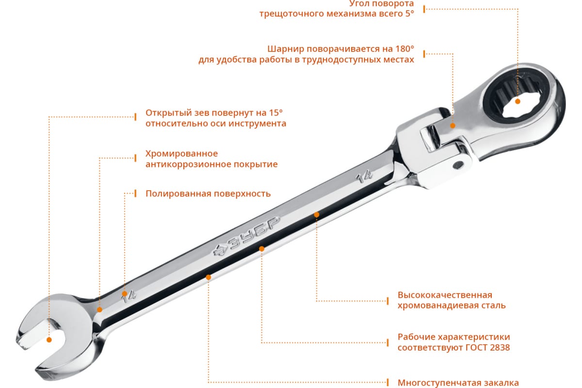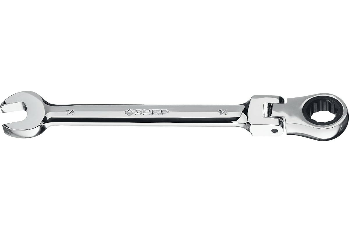 Комбинированный гаечный ключ трещоточный шарнирный Зубр ПРОФ 27101-14 подойдет для работы с различными видами шестигранного крепежа.