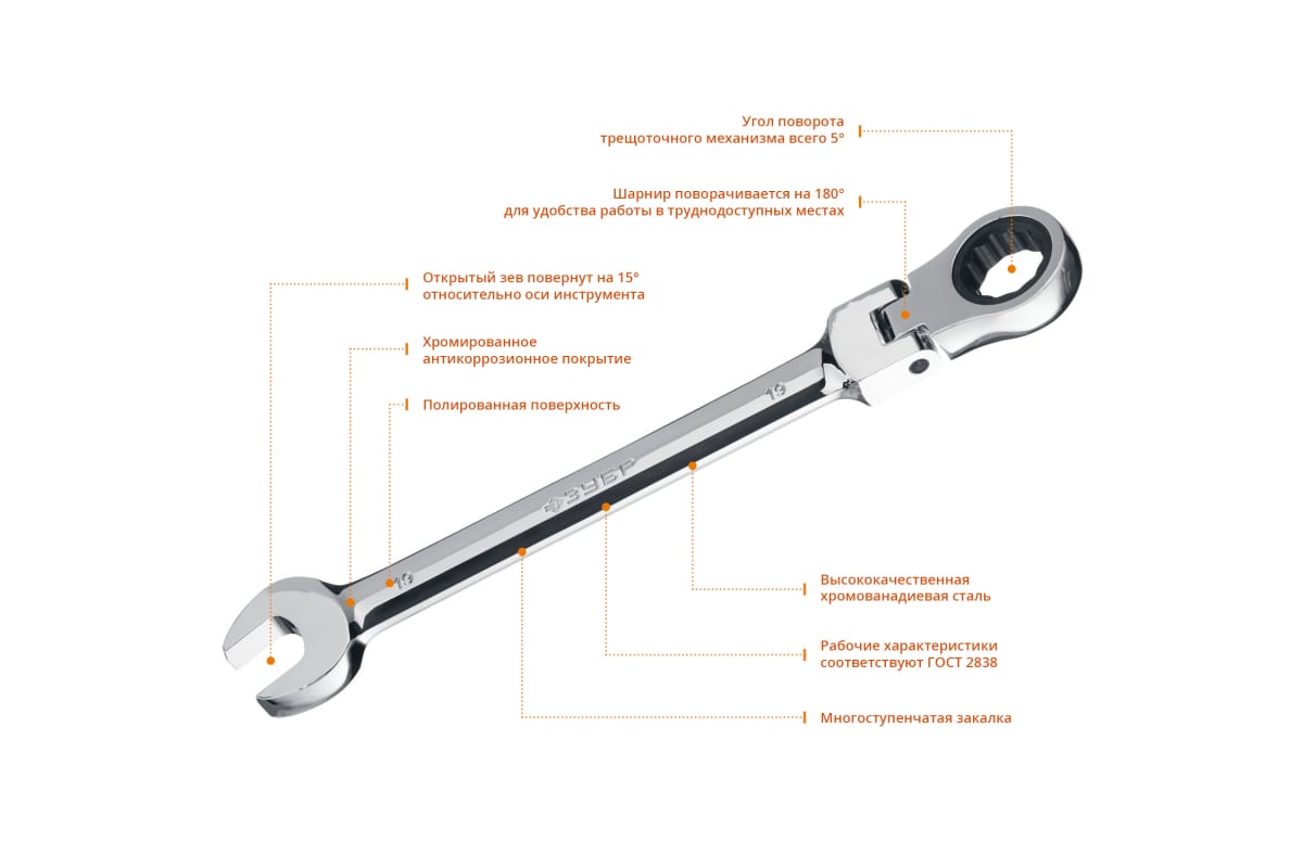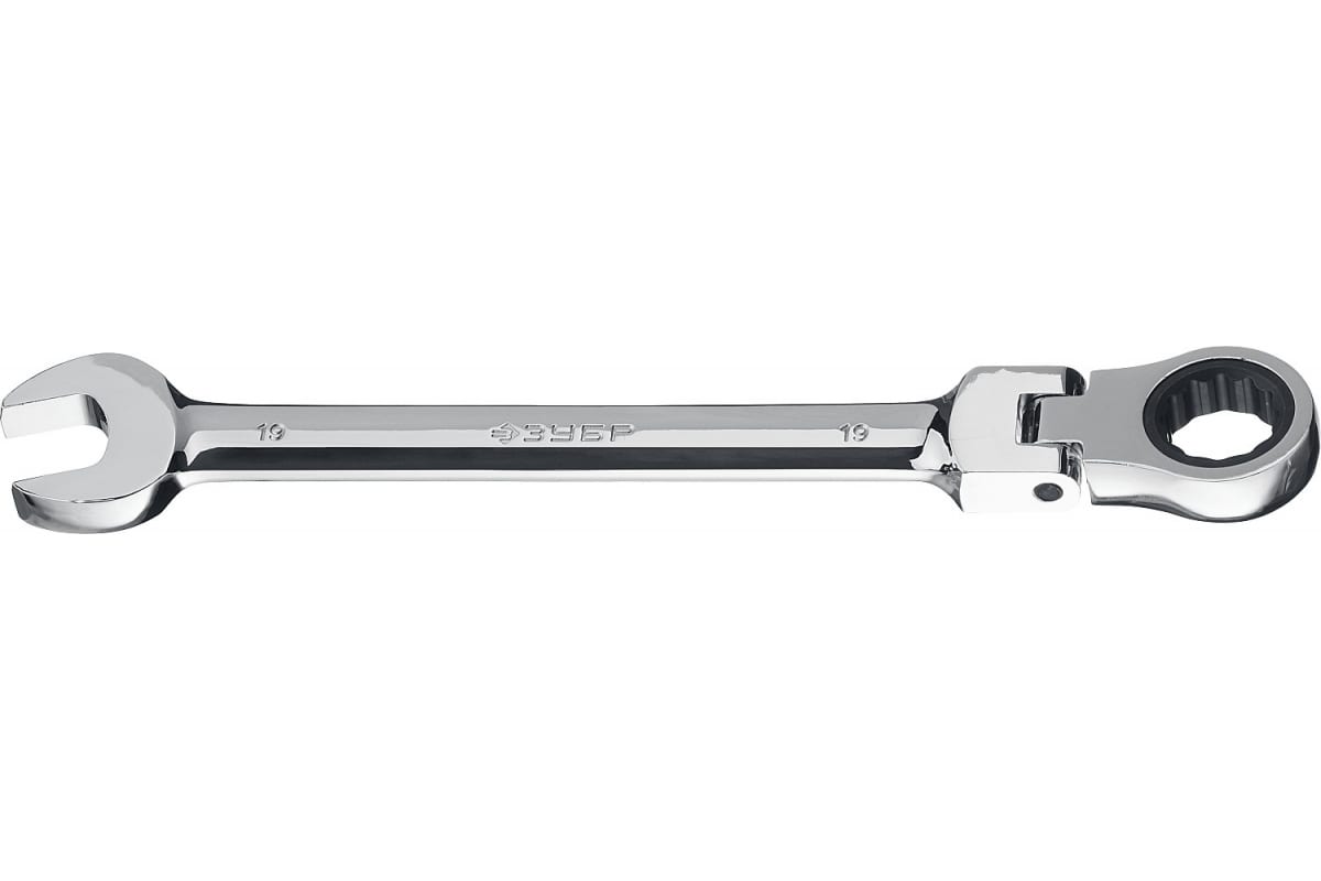 Комбинированный гаечный ключ трещоточный шарнирный Зубр ПРОФ 27101-19 подойдет для работы с различными видами шестигранного крепежа.