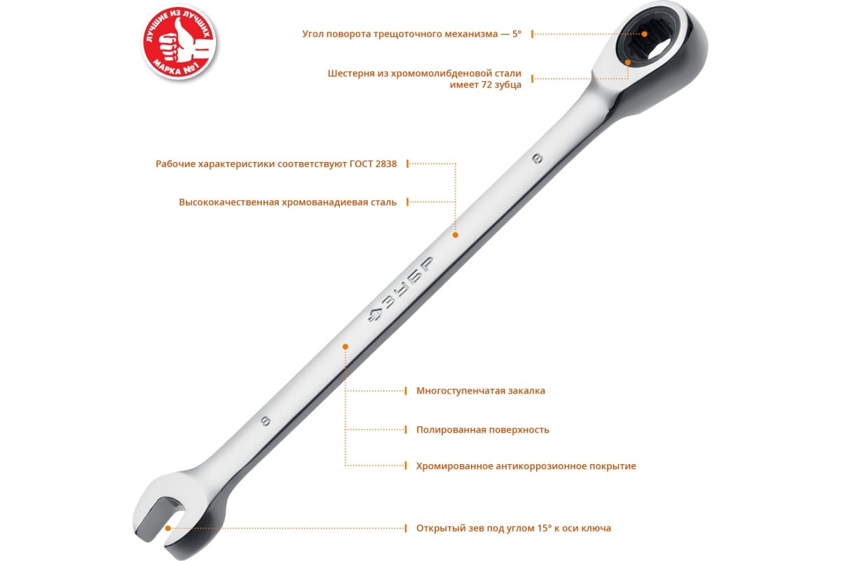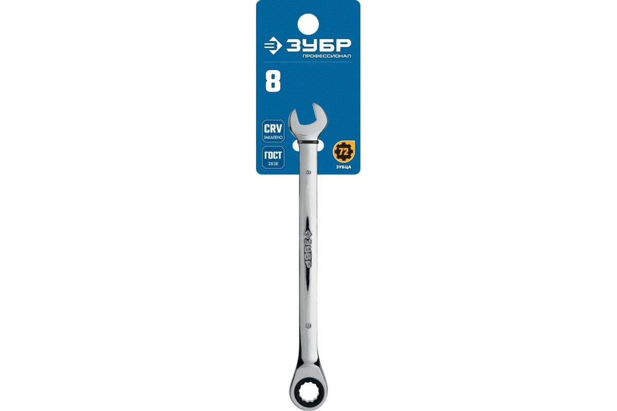 Комбинированный гаечный трещоточный ключ 8 мм Зубр 27074-08_z01 позволяет вращать крепеж с минимальным углом 5 градусов.