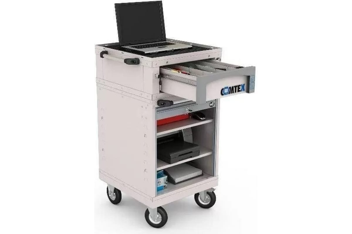 Компьютерная тележка ДВК COMTEX 1М №2 Б04650 предназначена для обустройства рабочих мест различного назначения, требующих оснащения компьютерами и оргтехникой. Это могут быть офисы, серверные, производственные участки, станции технического обслуживания и диагностики автомобилей. Порошковое покрытие корпуса тележки обеспечивает защиту от коррозии.