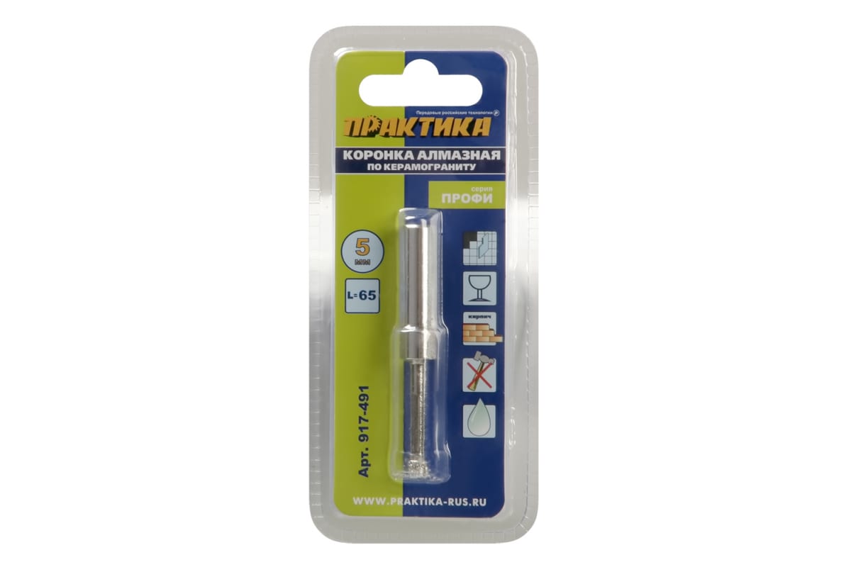 Коронка алмазная ПРАКТИКА 917-491 предназначена для дрелей. Применяется для сверления отверстий в керамограните, керамической плитке и изделиях из керамики. Ограниченно подходит для сверления толстого стекла. Работать коронкой необходимо в безударном режиме сверления и с охлаждением водой. Рекомендуется ограничивать скорость подачи и частоту оборотов во избежание перегрева коронки.