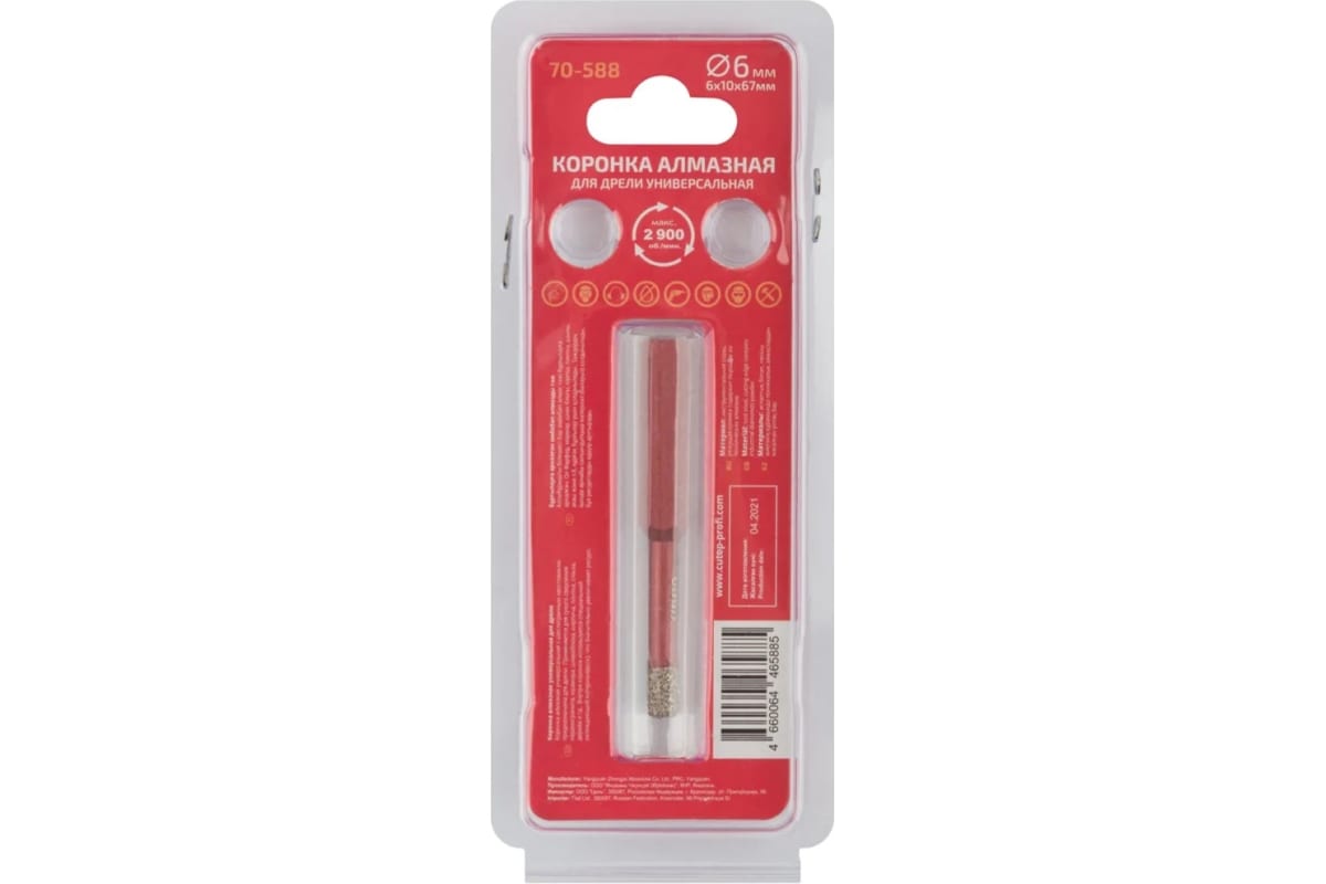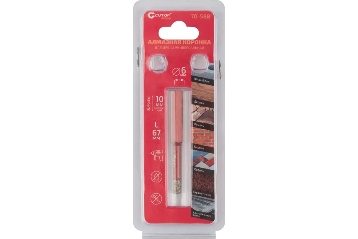 Коронка алмазная универсальная Special 6x10x67 мм для дрели CUTOP 70-588 предназначена для дрели. Применяется для сухого сверления керамогранита, мрамора, шлакоблока, кирпича, плитки, стекла, дерева и т. д.