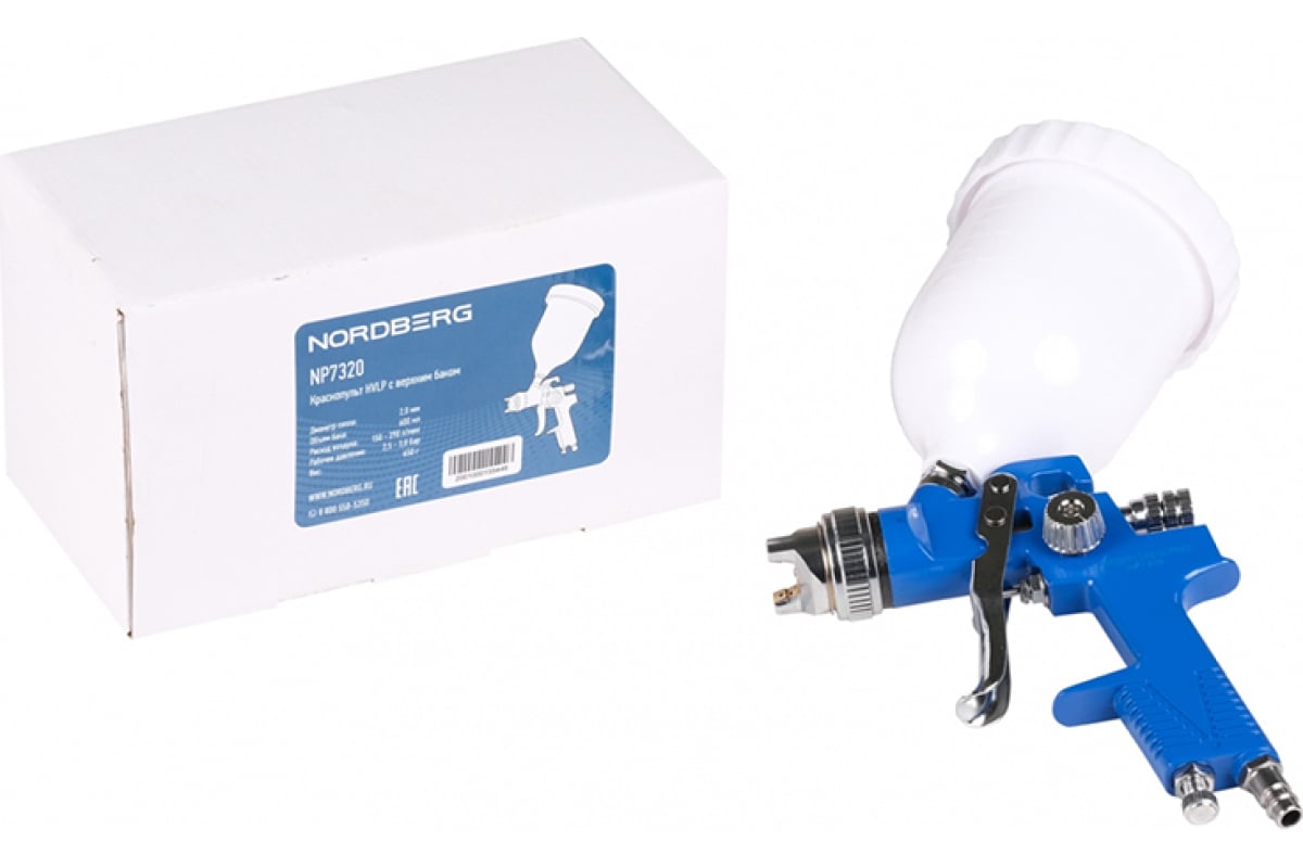 Краскопульт NORDBERG HVLP с верхним баком, сопло 2.0 мм NP7320 предназначен для распыления лакокрасочных материалов.