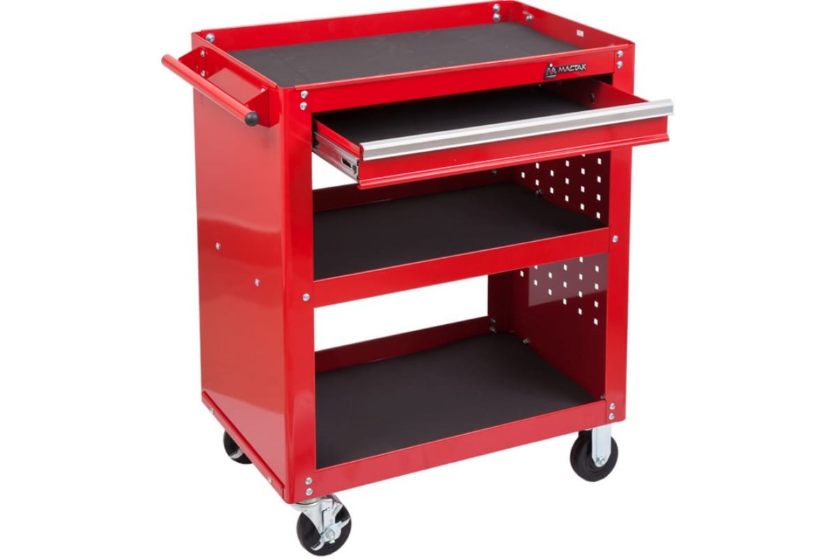 Красная открытая тележка (3 полки и ящик) МАСТАК 520-01580 используется в автосервисах, частных и коммерческих гаражах для упорядоченного хранения инструмента, а также организации рабочего места автомеханика. Роликовые колеса обпеспечивают удобство перемещения модели по ровной площадке. Антикоррозийное покрытие бережет корпус тележки от разрушения.