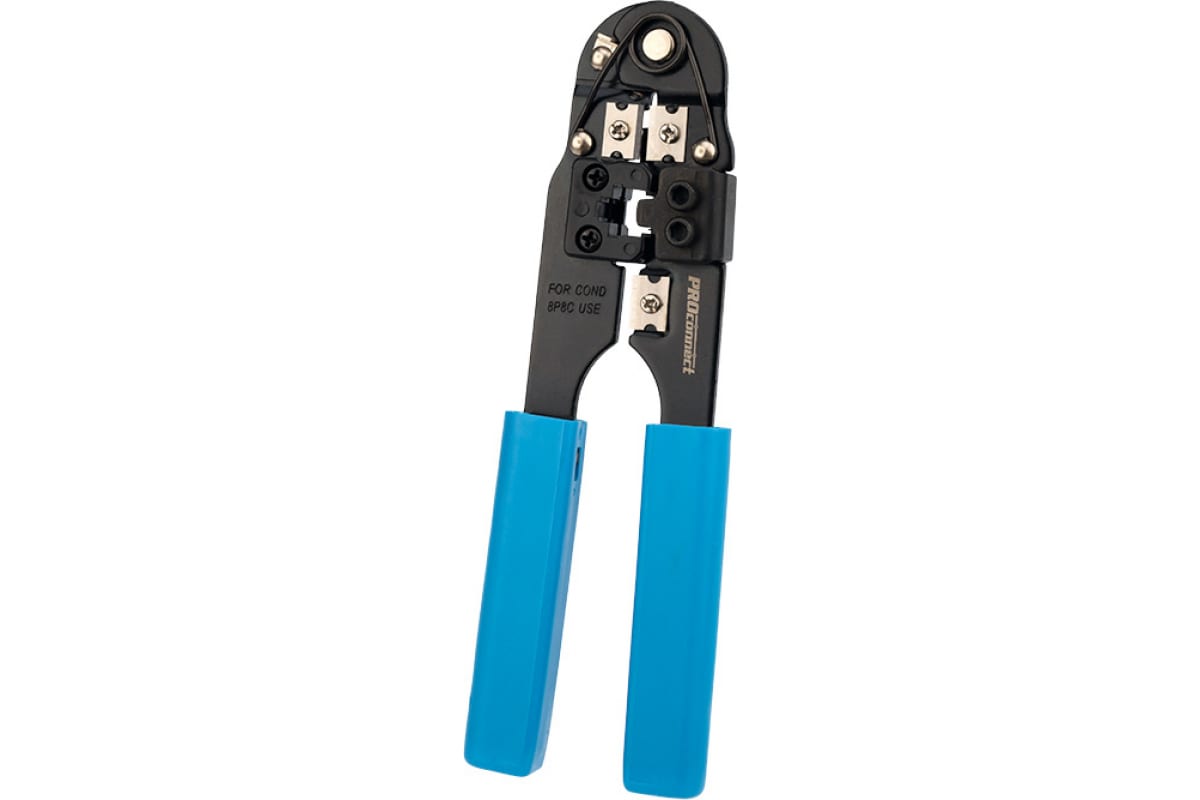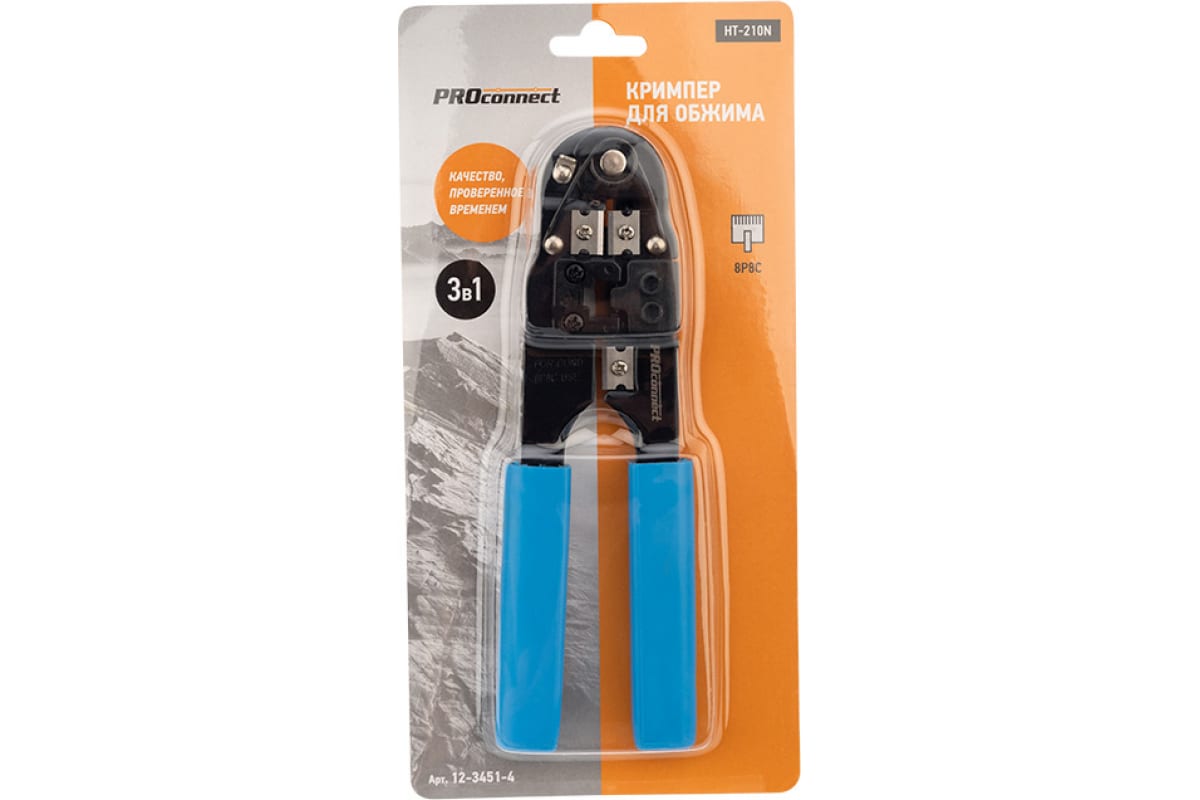 Кримпер для обжима PROconnect HT-210N 8P8C 12-3451-4 — универсальный инструмент для обжима разъемов RJ-45 (8P8C), а также для снятия изоляции и обрезки проводов.