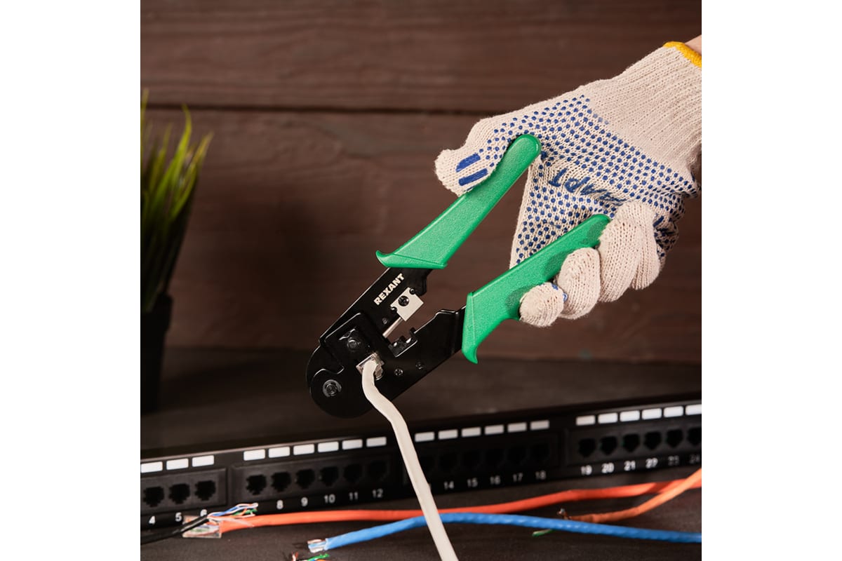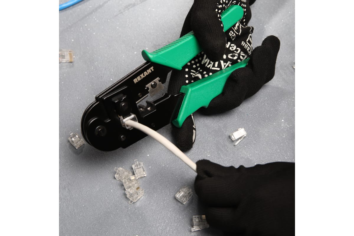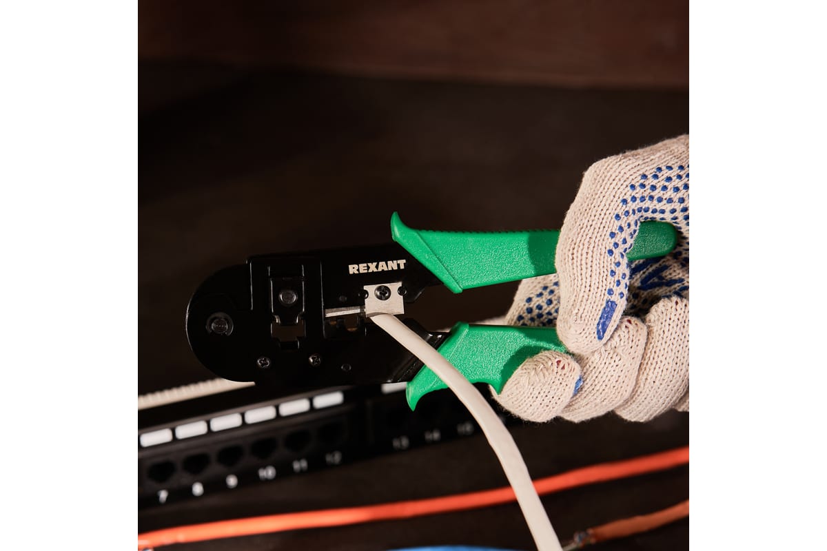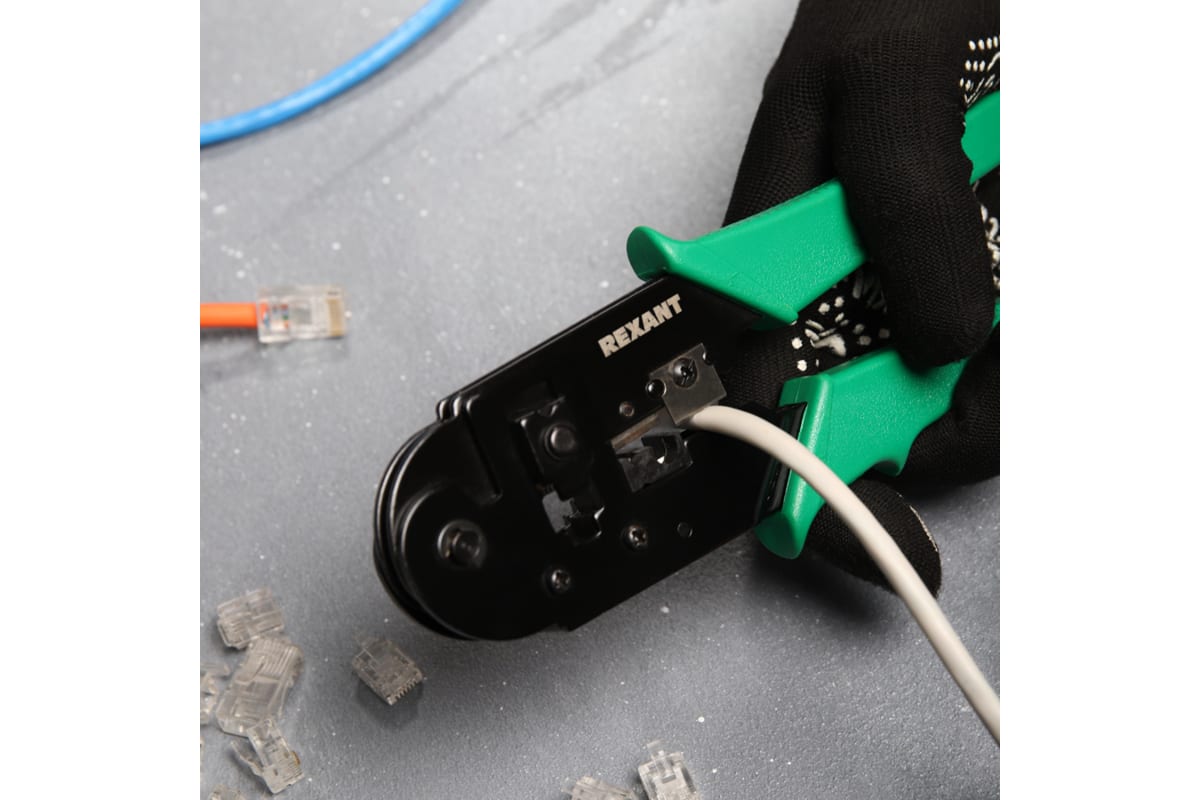 Кримпер REXANT HT-210T — универсальный инструмент для обжима разъемов RJ-45 (8P8C), а также для снятия изоляции как с кабеля, так и с жилы и обрезки проводов.