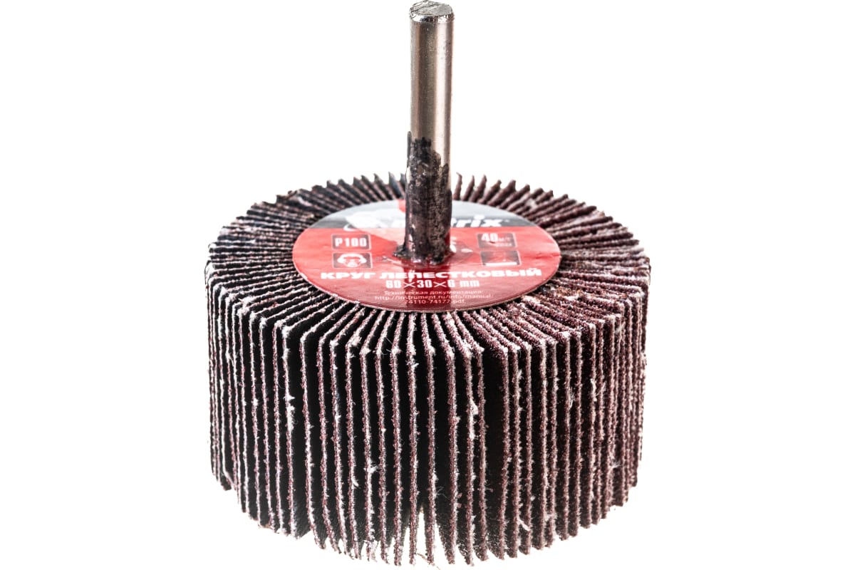 Лепестковый круг для дрели Matrix 74125, 60 х 30 х 6 мм, с зернистостью P 100, устанавливается в патрон дрели или прямой шлифовальной машины с посадочным диаметром 6 мм и максимальной скоростью вращения 8000 об/мин. Оснастка применяется для радиальной шлифовки внутренних и наружных поверхностей. Среднезернистый абразив P 100 эффективно справляется с промежуточной обработкой металла и древесины - снятием тонкого слоя лака, краски, ржавчины и заусенцев.