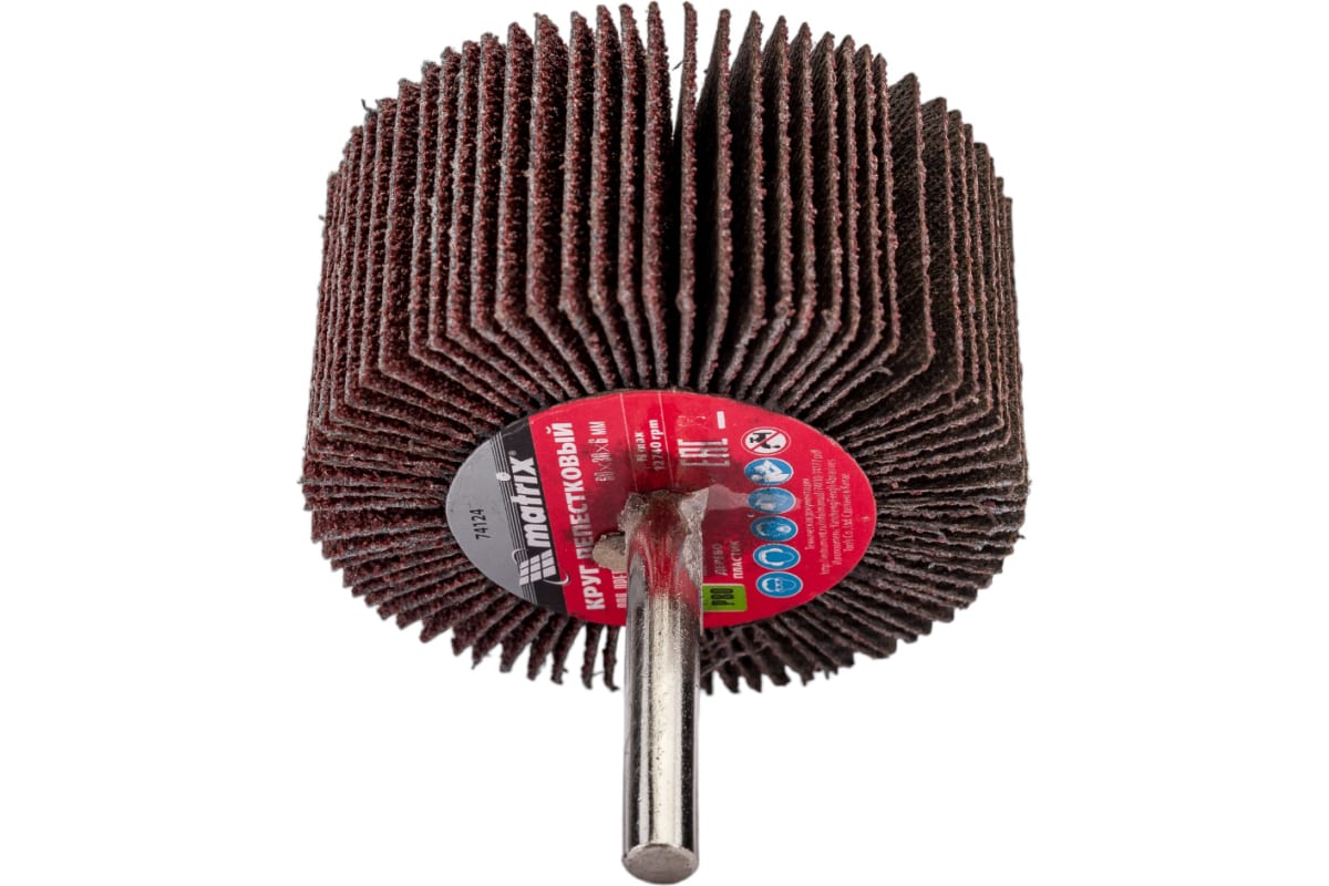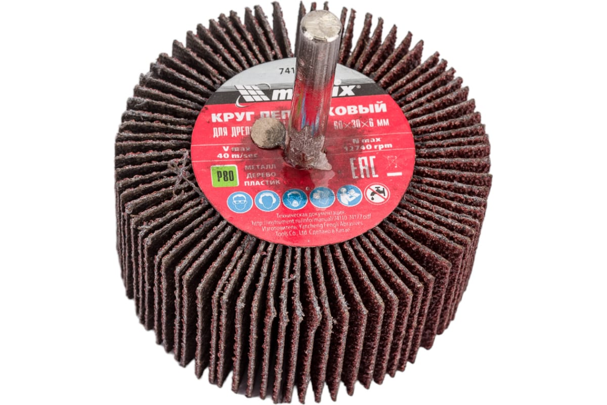 Лепестковый круг для дрели Matrix 74124, 60 х 30 х 6 мм, с зернистостью P 80, используется совместно с дрелями и прямыми шлифовальными машинами с посадочным диаметром 6 мм и максимальной скоростью вращения 8000 об/мин. Оснастка предназначена для радиального шлифования внутренних и наружных поверхностей. Абразив P 80 позволяет проводить промежуточную обработку древесины и металла - удалять заусенцы, слои лака, ржавчины или краски, зачищать сварные швы, готовить поверхности к чистовому шлифованию.