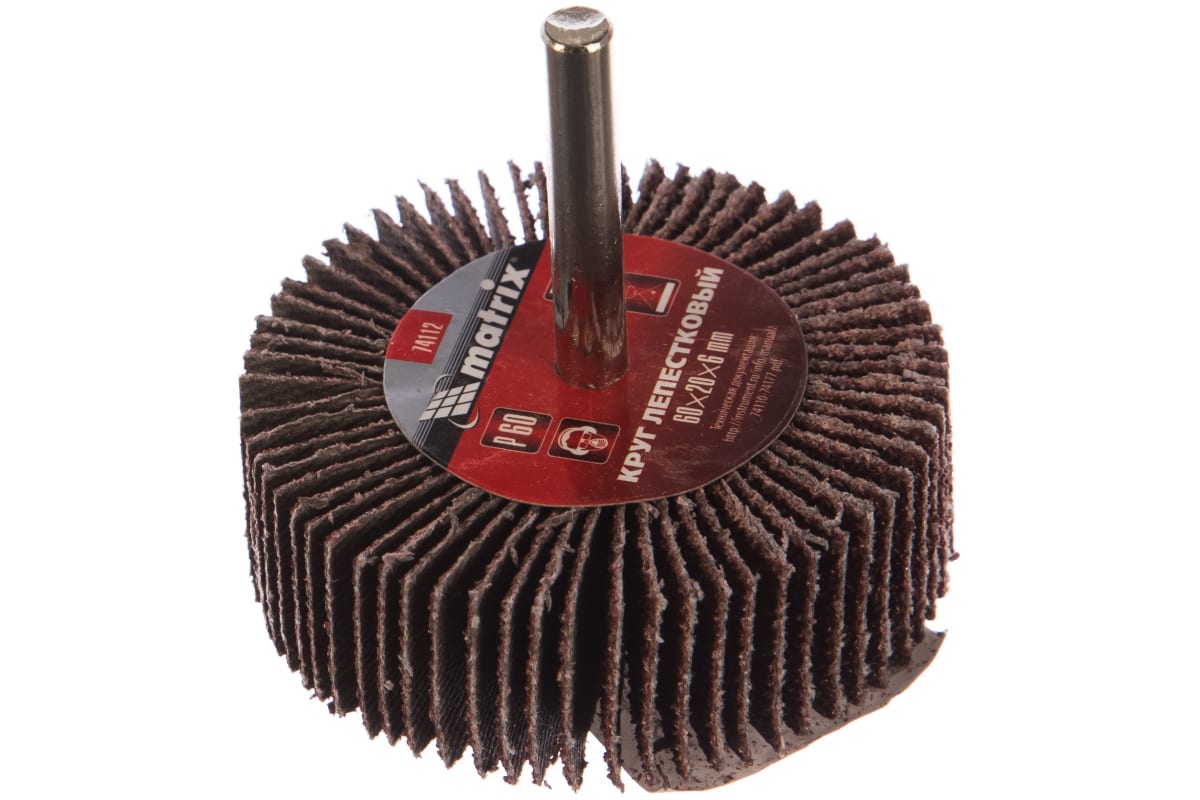 Лепестковый круг для дрели Matrix 74112, 60 х 20 х 6 мм, с зернистостью P 60, используется для черновой обработки металлических и деревянных поверхностей. Он имеет стальной хвостовик диаметром 6 мм, при помощи которого устанавливается в патрон дрели или прямой шлифовальной машины с максимальной скоростью вращения 8000 об/мин. Крупнозернистый абразив P 60 легко удаляет слои ржавчины, краски и лака, обрабатывает сварные швы, удаляет заусенцы.