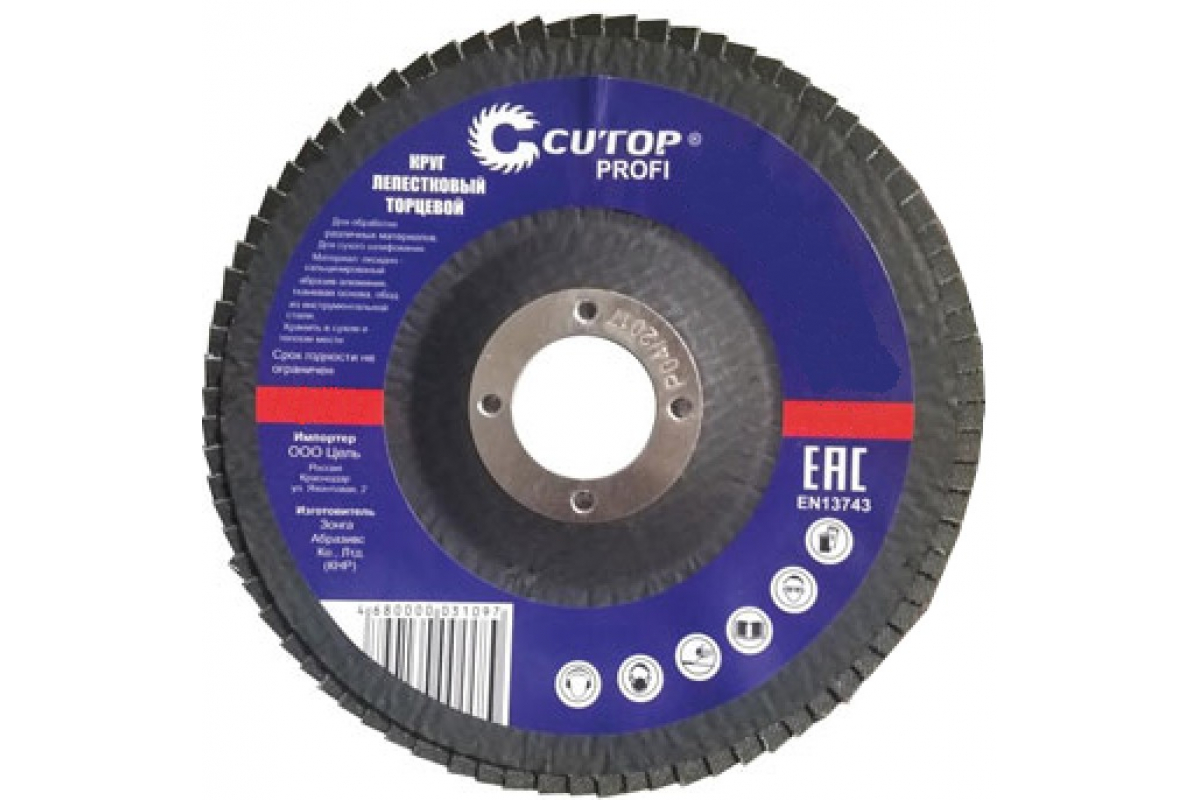 Круг наждачный лепестковый (150х22.2 мм; Р120) CUTOP 70-405 изготовлен из гибкого абразивного материала высокого качества, который состоит из тканевой основы с нанесенным слоем кальцинированного оксида алюминия. Применяемый абразив имеет более твердые частицы, чем обычный оксид алюминия - Корунд. Круг имеет 96 лепестков, угол наклона 10 градусов. Используется для обработки металла и нержавеющей стали.