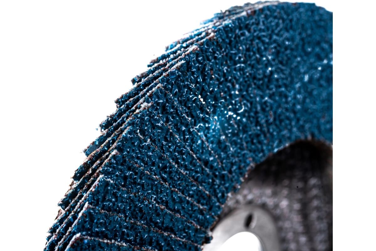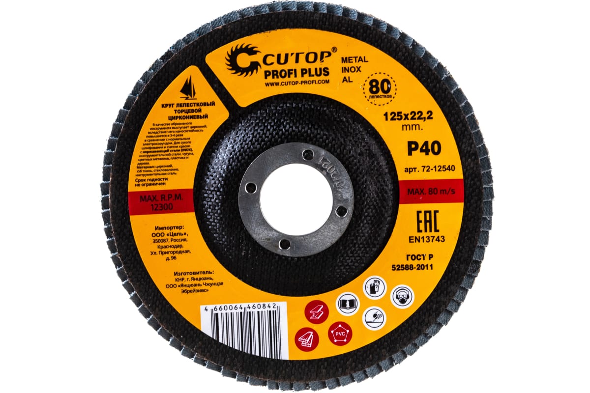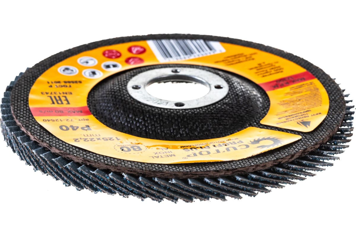 Круг наждачный лепестковый по металлу Plus (125 х 22.2 мм; Р40; циркониевый) CUTOP 72-12540 производится из гибкого абразивного материала высокого качества, состоящего из тканевой основы с нанесенным слоем циркониевого электрокорунда. Обладает повышенной прочностью и имеет коэффициент шлифования в несколько раз выше, чем круги на основе нормального электрокорунда. Структура циркониевого электрокорунда даёт эффект самозатачивания, что также увеличивает ресурс использования. Наполняемость диска составляет 80 лепестков, угол наклона 10 градусов. Диск применяется для обработки металла, нержавеющей стали, сварных швов, пластика, дерева.