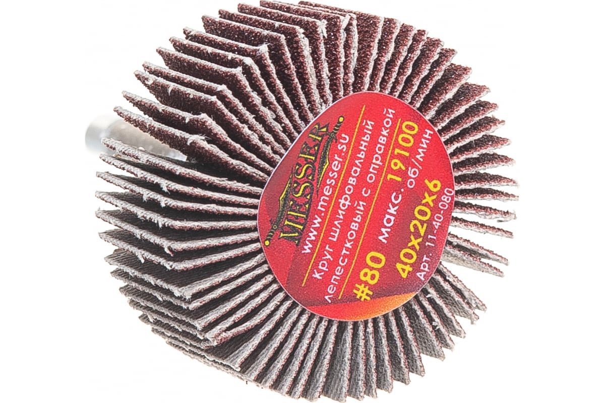 Круг шлифовальный лепестковый с оправкой на шпильке (40х20х6 мм; P80) MESSER 11-40-080 используется на прямых шлифовальных машинках с цангой 6мм.