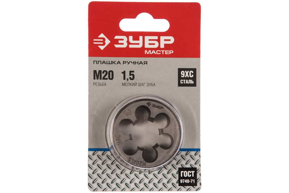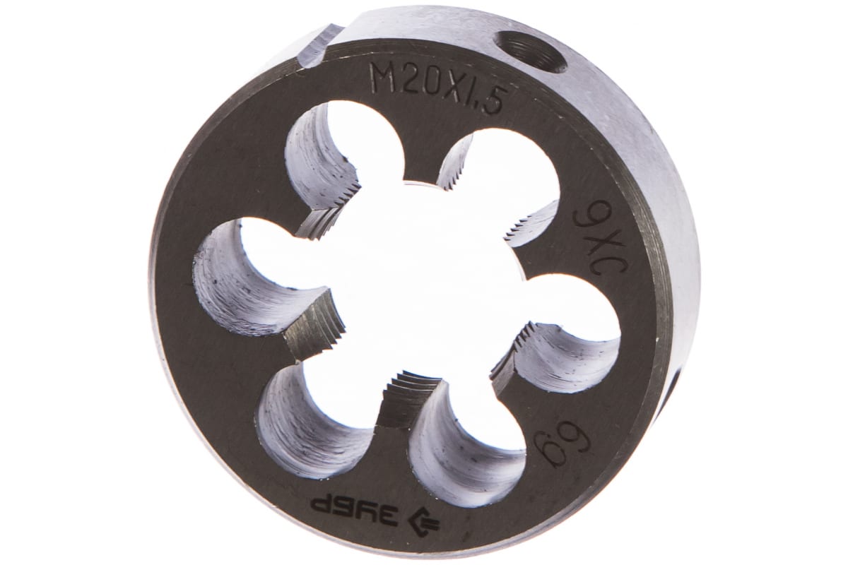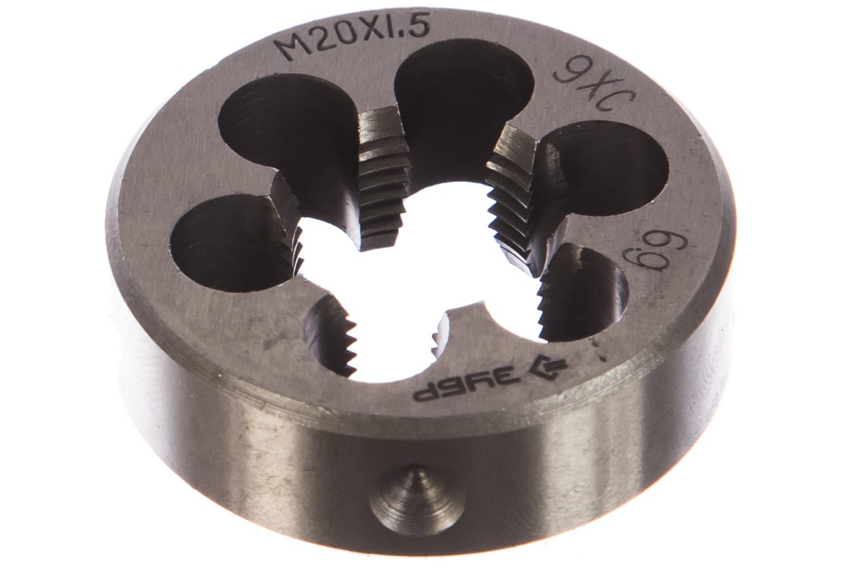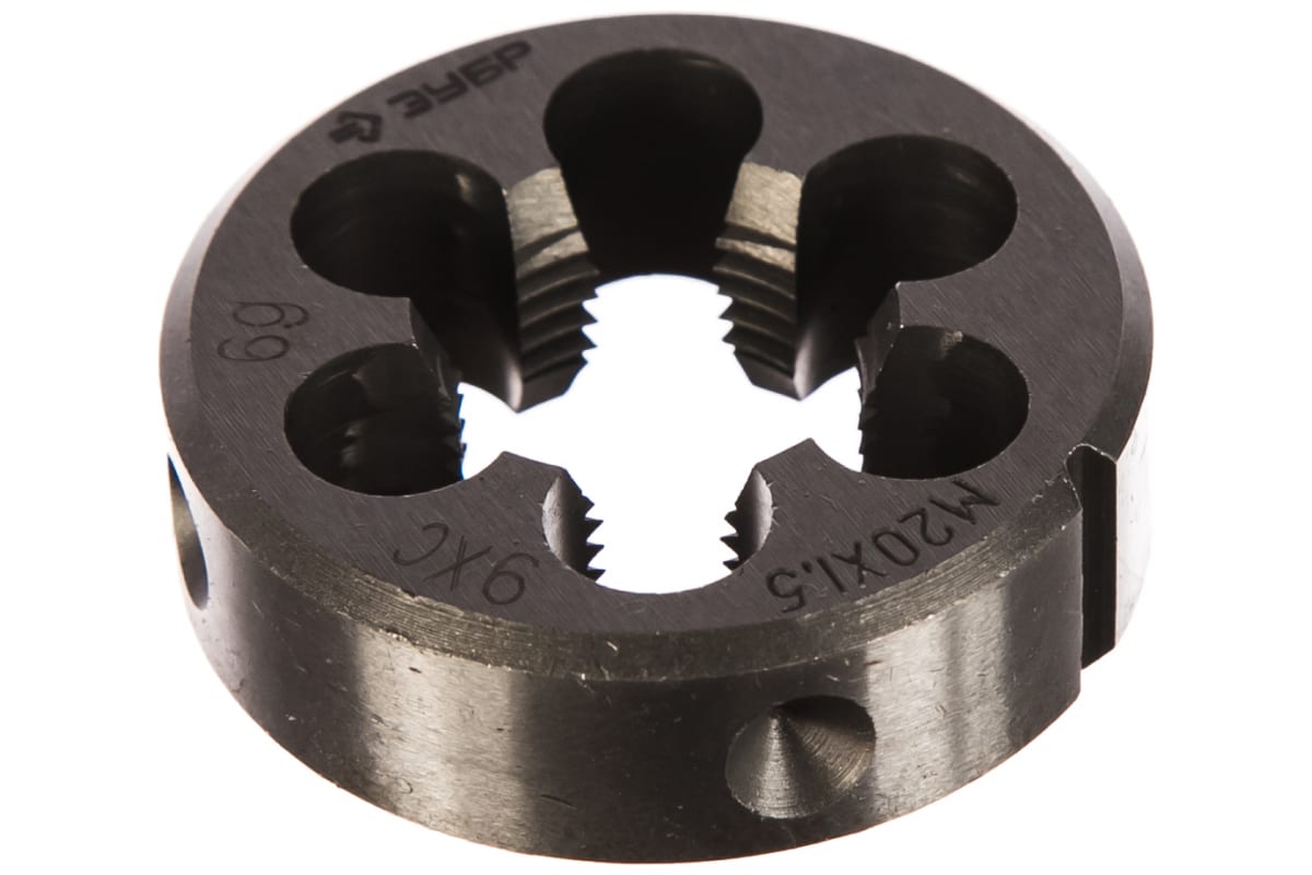Круглая ручная плашка для нарезания метрической резьбы, мелкий шаг, Зубр "МАСТЕР" М20x1,5 4-28022-20-1.5 выполнена из легированной стали 9ХС. Сплав дополнен хромом, кремнием и углеродом для большей жесткости.