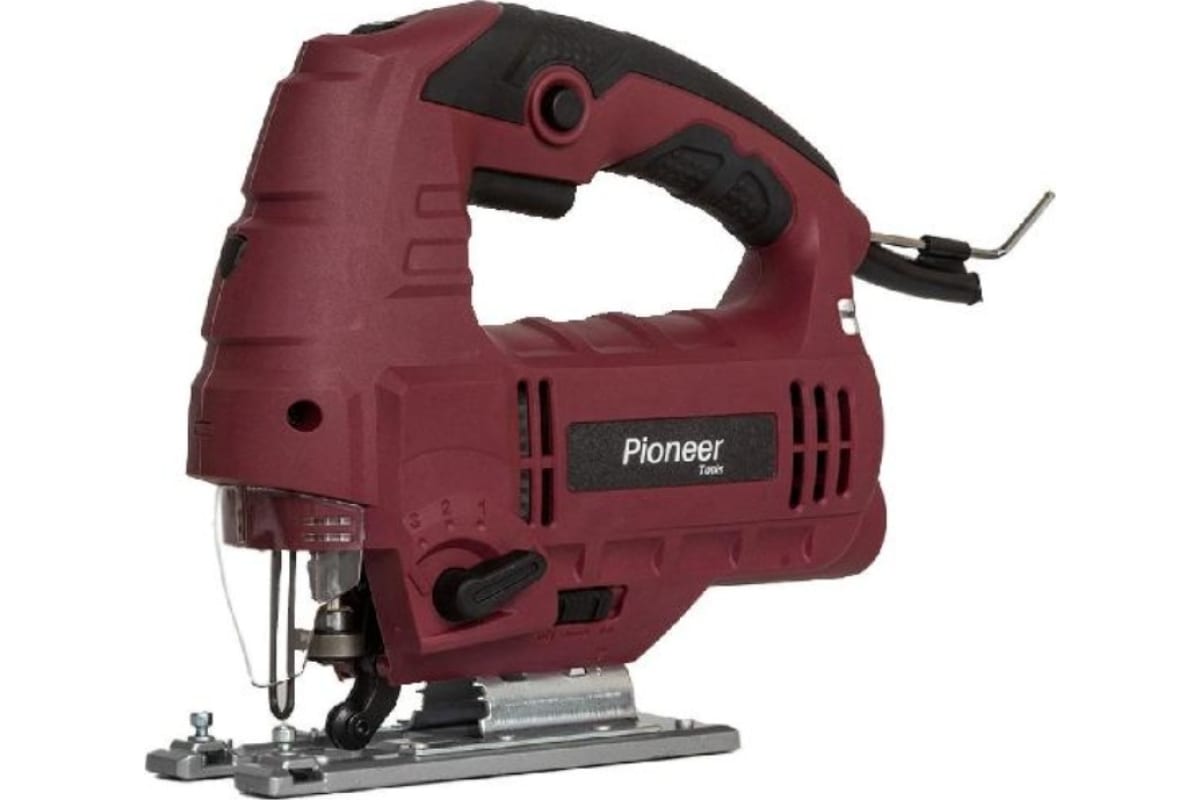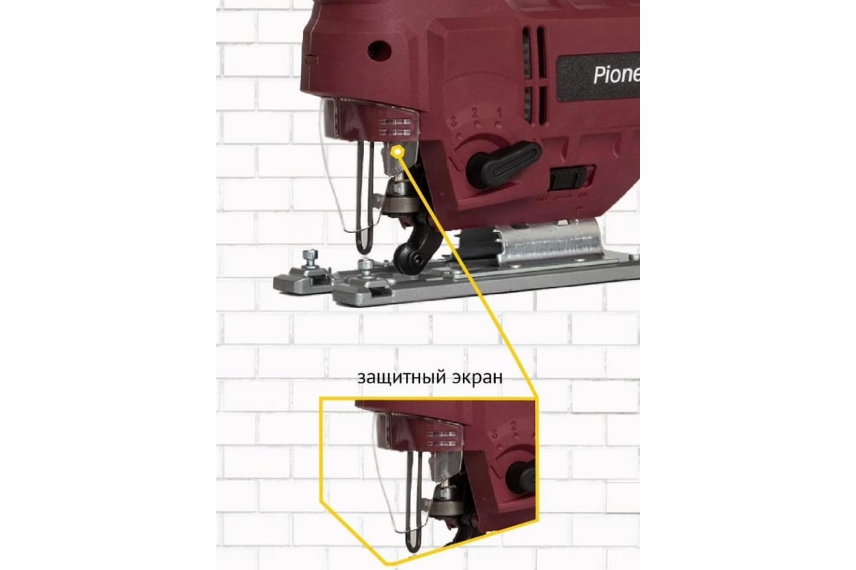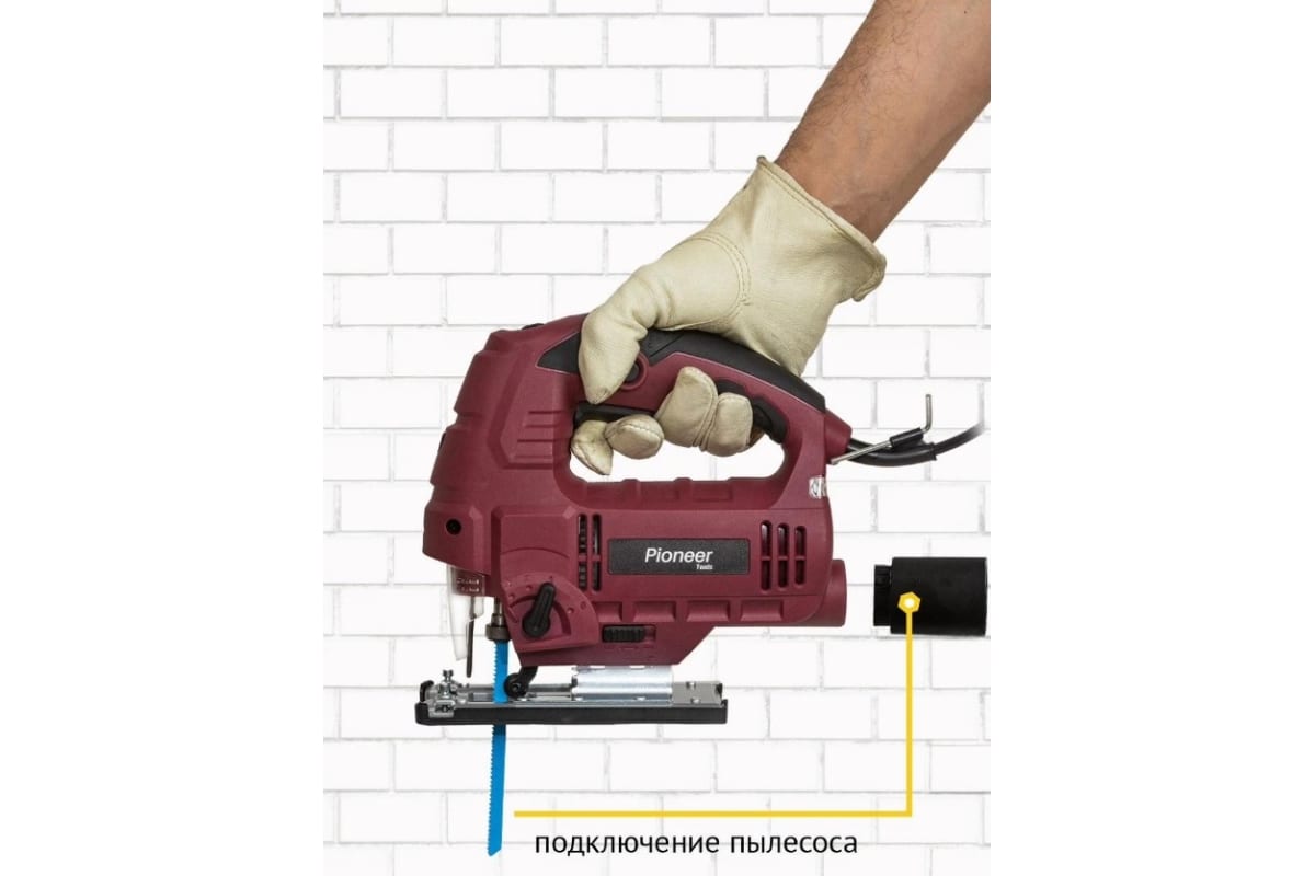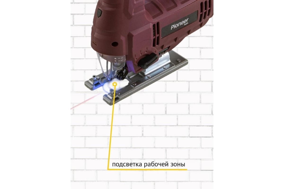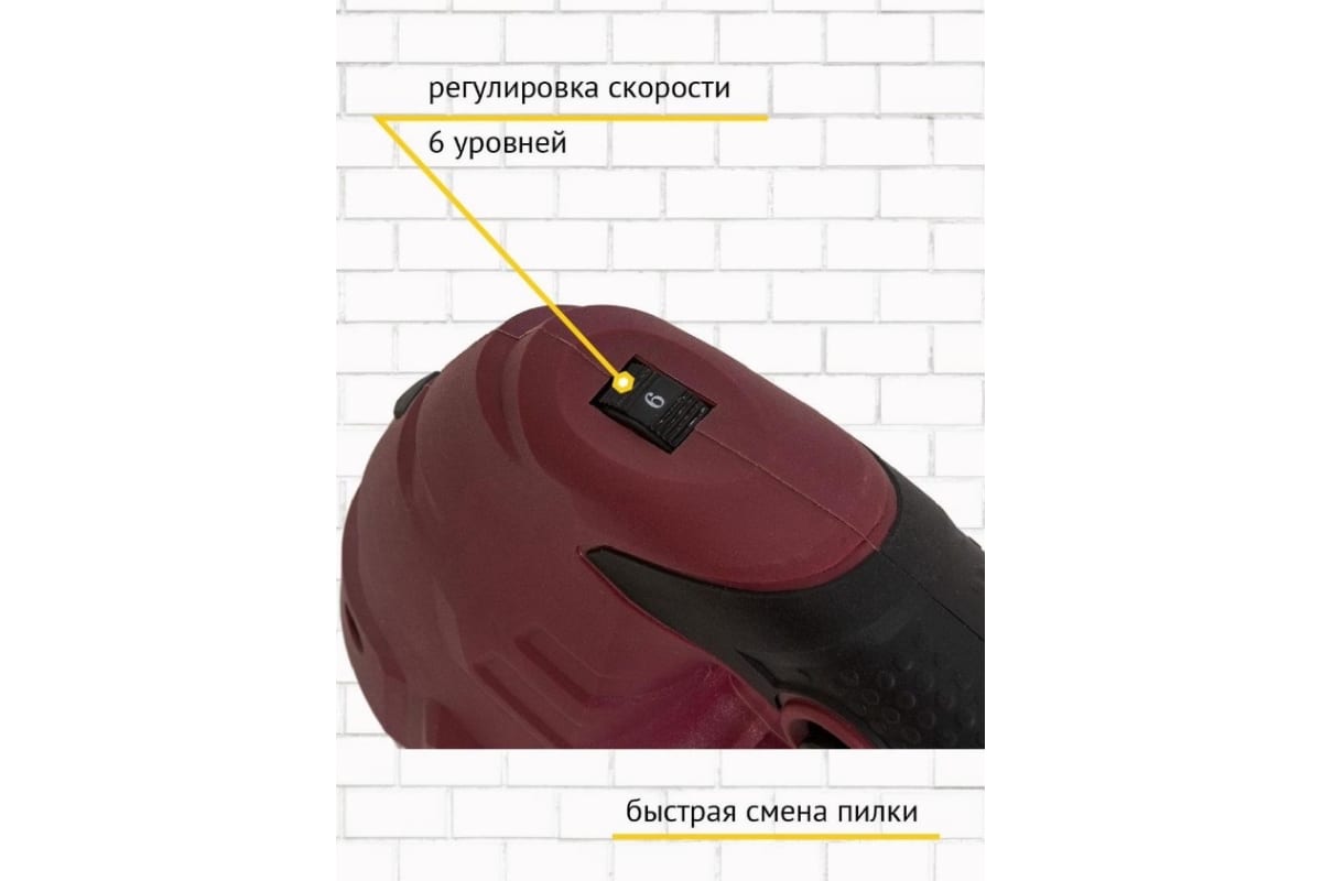 Электролобзик сетевой инструмент мощностью 900 Вт. Для подключения используется кабель длиной 2 м. Маятниковый ход регулируется в четырех режимах, скорость — на шести уровнях. Частота хода достигает 3000 движений в минуту. Корпус выполнен из ударопрочного пластика и металла. Рукоять снабжена противоскользящим покрытием. Наклон подошвы можно менять в диапазоне от 0° до 45°. Эта модель снабжена лампой точечной подсветки и лазерным указателем. В прибор заложена функция выдувания опилок, есть возможность подключить пылесос. Лобзик оборудован креплением, позволяющим менять пилку без ключа.