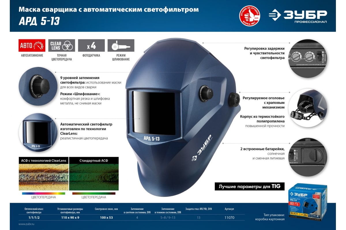 Маска сварщика с автоматическим светофильтром ЗУБР АРД 5-13, затемнение 4/5-8/9-13, 11070 применяется для индивидуальной защиты лица и глаз сварщика от яркого светового, ультрафиолетового и инфракрасного излучения, брызг расплавленного металла и искр.