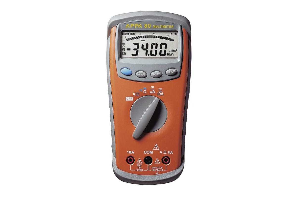Мультиметр APPA 80 служит для измерения постоянного и переменного напряжения, постоянного и переменного тока, сопротивления. А также есть возможность проверки диодов и прозвонки электрических цепей, что делает прибор универсальным.
