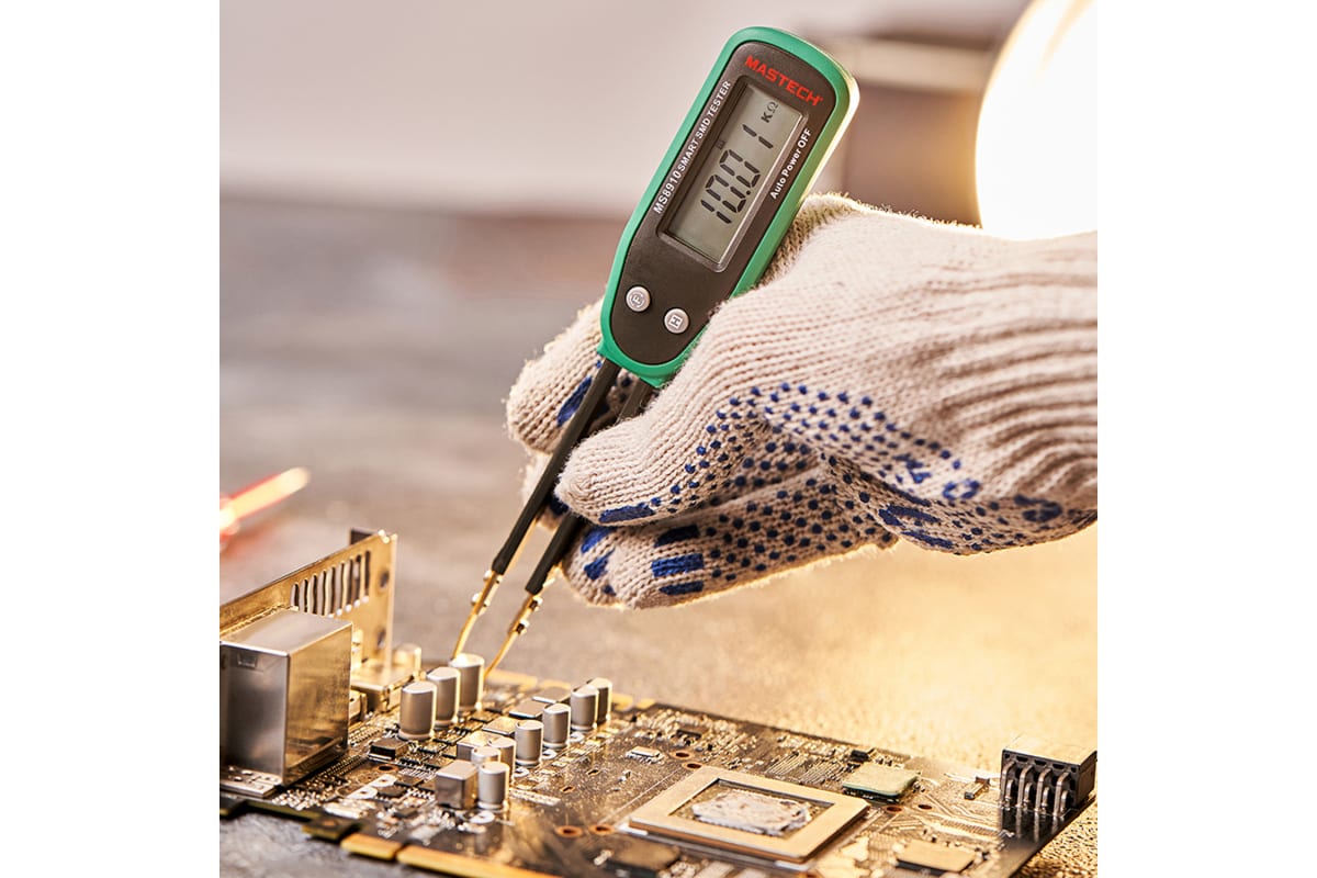 Измерительные щупы очень тонкие, специально спроектированы для удобного использования при тестировании ЧИП элементов, которые можно заменить на запасные в случае поломки. Питание прибора производится от 3-вольтовой дисковой батарейки CR2032. Прибор поставляется в комплекте с пластиковым кейсом.