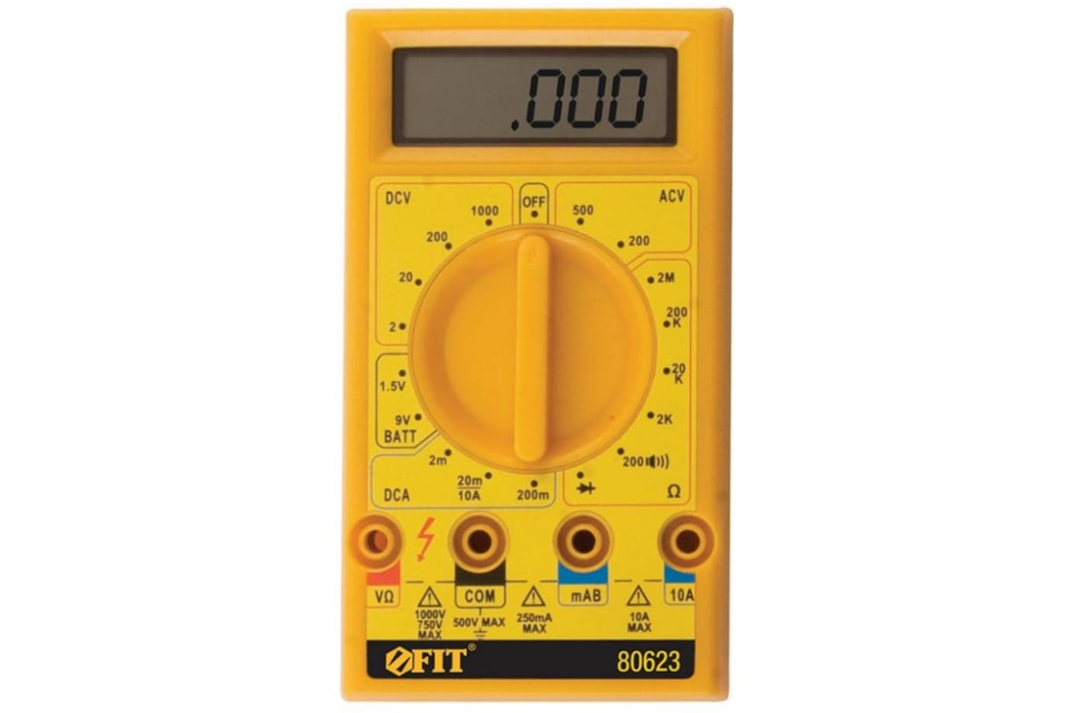 Мультиметр FIT EM5308B 80623 предназначен для измерения сопротивления, постоянного тока, постоянного/переменного напряжения. Он оснащен большим экраном, на котором отображаются все результаты измерений. Режим проверки целостности цепи сопровождается звуковым сигналом. Конструкцией предусмотрена подставка на задней крышке, что обеспечивает удобство пользования. Модель работает от батареи 9 В. Имеется индикация разряда батареи.